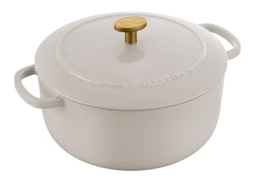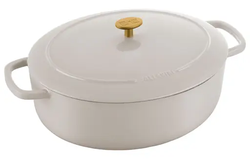 Prezentowany owalny garnek w kolorze kości słoniowej o wymiarach 30,1 x 23 x 7,6 cm oraz pojemności 2,2 L wykonany został z żeliwa, które wyróżnia się wyjątkowo dobrym magazynowaniem i rozprowadzaniem ciepła oraz sprawia, że potrawy są szczególnie aromatyczne i mają charakterystyczny, pieczony aromat. Naczynie pokryte zostało wyjątkowo odporną na zarysowania powłoką emaliowaną, co zwiększa jego trwałość. W komplecie dołączona została dopasowana pokrywka o strukturze kropel, która pozwala na równomierne rozprowadzenie wilgoci, nadając potrawom bardzo dobry smak i delikatną konsystencję. Jej matowy uchwyt w kolorze złotym ozdobiony został logiem marki. Garnek nadaje się do używania na otwartym ogniu, wszystkich rodzajach kuchenek oraz w piekarniku (do 240°C). Idealnie sprawdzi się on do powolnego gotowania. Dodatkowo jego niewątpliwą zaletą jest możliwość mycia zarówno ręcznie jak i w zmywarce, co znacznie ułatwi czyszczenie.