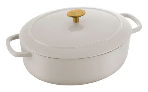Prezentowany owalny garnek w kolorze kości słoniowej o wymiarach 41,4 x 33 x 11 cm oraz pojemności 6,5 L wykonany został z żeliwa, które wyróżnia się wyjątkowo dobrym magazynowaniem i rozprowadzaniem ciepła oraz sprawia, że potrawy są szczególnie aromatyczne i mają charakterystyczny, pieczony aromat. Naczynie pokryte zostało wyjątkowo odporną na zarysowania powłoką emaliowaną, co zwiększa jego trwałość. W komplecie dołączona została dopasowana pokrywka o strukturze kropel, która pozwala na równomierne rozprowadzenie wilgoci, nadając potrawom bardzo dobry smak i delikatną konsystencję. Jej matowy uchwyt w kolorze złotym ozdobiony został logiem marki. Garnek nadaje się do używania na otwartym ogniu, wszystkich rodzajach kuchenek oraz w piekarniku (do 240°C). Idealnie sprawdzi się on do powolnego gotowania. Dodatkowo jego niewątpliwą zaletą jest możliwość mycia zarówno ręcznie jak i w zmywarce, co znacznie ułatwi czyszczenie.
