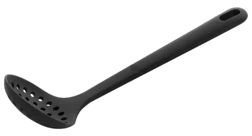 Prezentowana mała łyżka szumówka o długości 31 cm znajdzie wszechstronne zastosowanie w kuchni m.in. pozwalając na łatwe wyjęcie makaronu, klusek lub warzyw z wody czy usuwanie niechcianej zawiesiny lub nadmiaru tłuszczu z bulionów, sosów i zup. Produkt wykonany został z bezpiecznego dla żywności, odpornego na temperaturę do 230°C silikonu o czarnym kolorze i nadaje się on do używania w kontakcie z naczyniami pokrytymi powłokami nieprzywierającymi - jest delikatny, dzięki czemu nie rysuje ich powierzchni. Ergonomiczny, antypoślizgowy uchwyt łyżki dobrze leży w dłoni podczas jej używania. Na jego końcówce umieszczono otwór pozwalający na zawieszenie łyżki na haczyku kuchennym, by można było mieć ją zawsze pod ręką. Łyżka nadaje się do mycia ręcznego lub przy pomocy zmywarki.