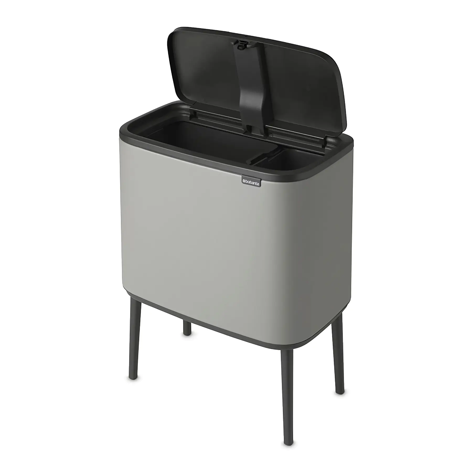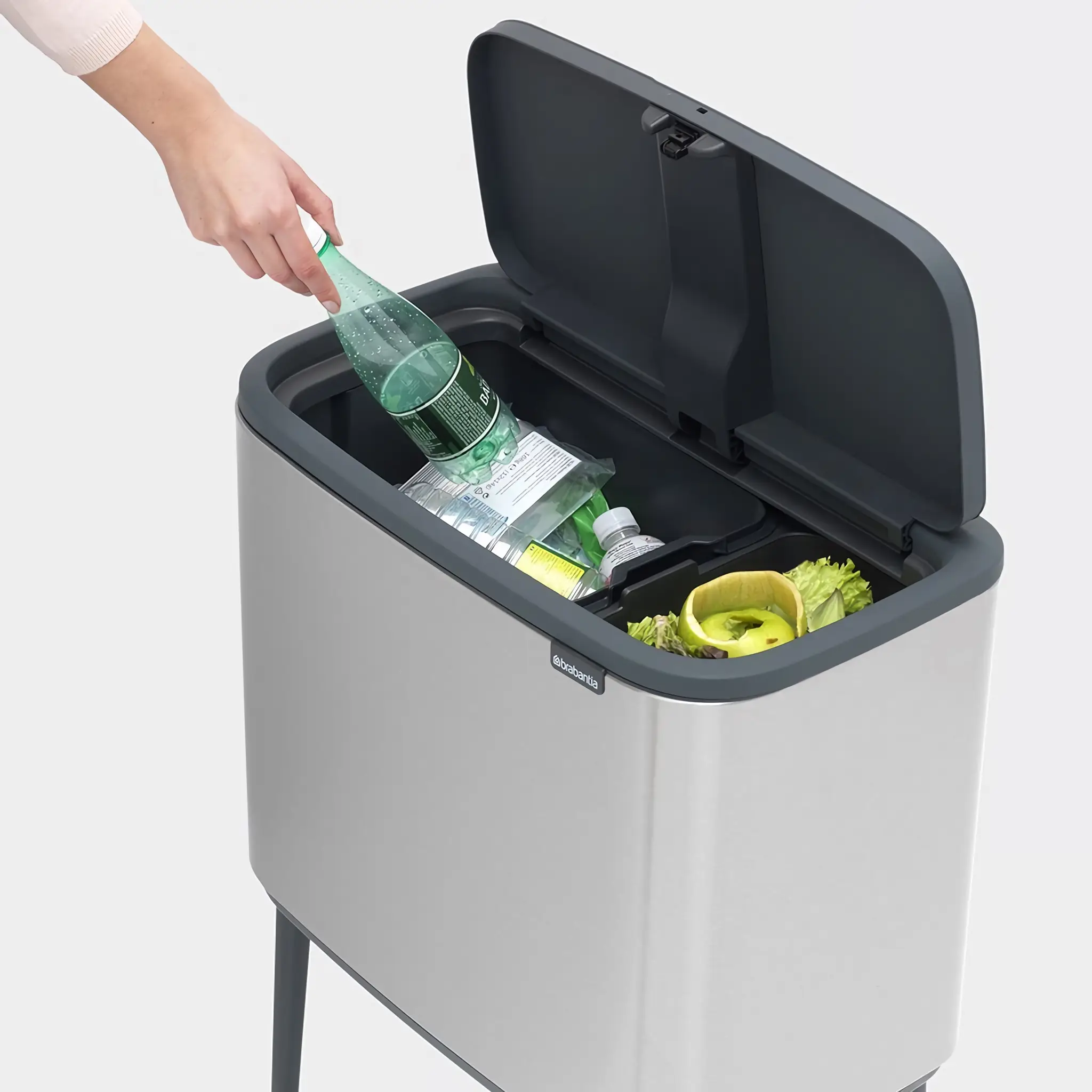 Brabantia Bo to seria koszy łącząca piękny design z dużą pojemnością użytkową. Doskonały do sortowania dzięki podziałowi na dużą i małą komorę. Zaprojektowany z myślą o przestrzeniach kuchennych oraz biurowych. Dotykowa pokrywa "Soft-Touch" z ulepszonym mechanizmem otwierania otwiera się i zamyka łatwiej niż kiedykolwiek. Aby go otworzyć wystarczy lekki dotyk pokrywy. Dzięki wyjątkowemu zawiasowi pokrywa otwiera się cicho i dyskretnie. Wyjmowane wewnętrzne, plastikowe wiaderko, ułatwia wymianę worków. Dzięki dużemu otworowi wrzutowemu bez problemu pozbędziemy obszernych odpadów bez ryzyka pobrudzenia kosza. Nóżki zostały wyposażone w antypoślizgowe nakładki, zapobiegające zarysowaniom podłogi.