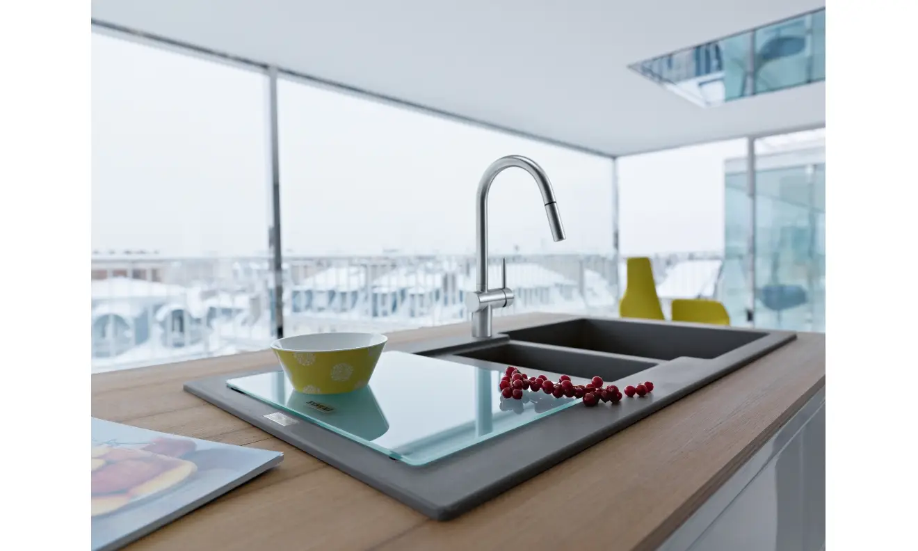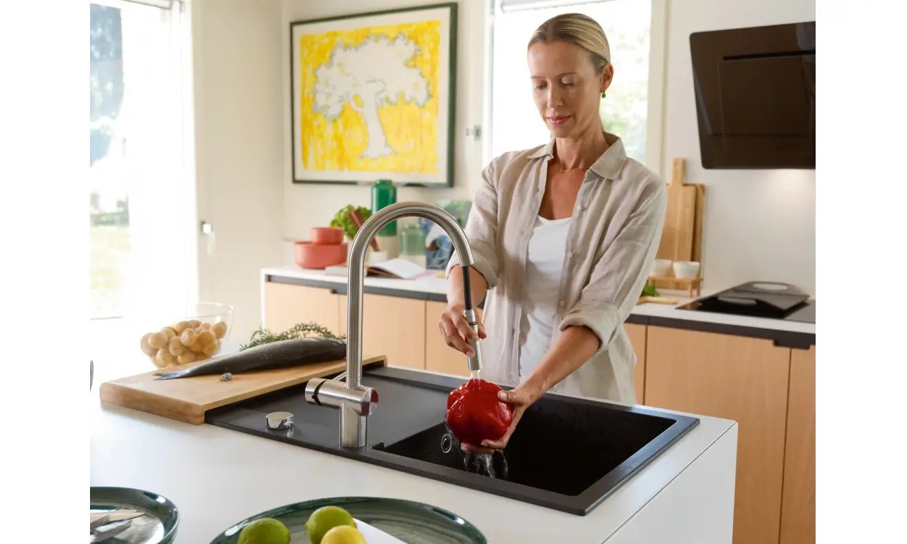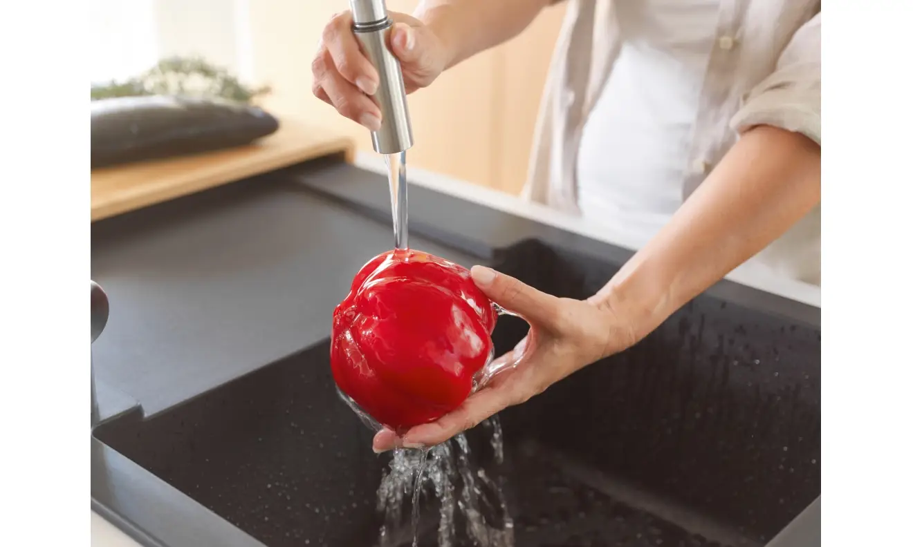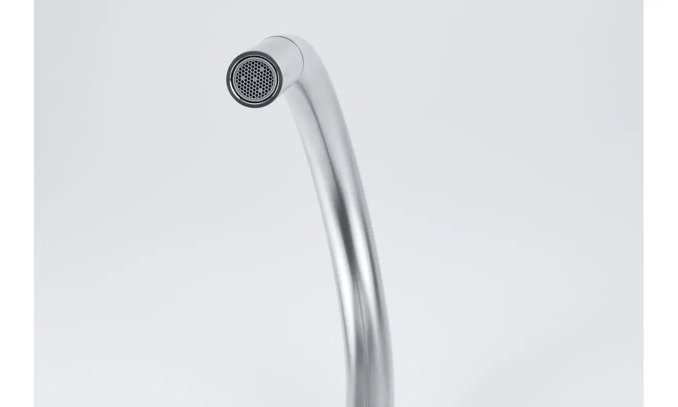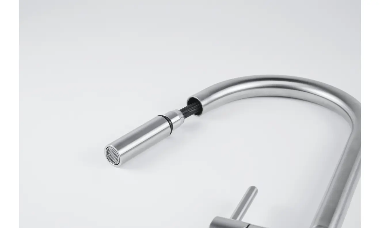 Bateria kuchenna Leda Neo pull-out zapewnia najwyższy komfort codziennego użytkowania, ułatwiając napełnianie większych naczyń, płukanie owoców i warzyw czy mycie zakamarków zlewozmywaka. Dźwignia mieszacza została przemyślana w każdym detalu, porusza się w zakresie od 0° do 90°, co umożliwia montaż baterii bezpośrednio przy ścianie, a nowoczesny aerator zapewnia zwarty strumień laminarny, który w znacznej mierze eliminuje rozpryski.