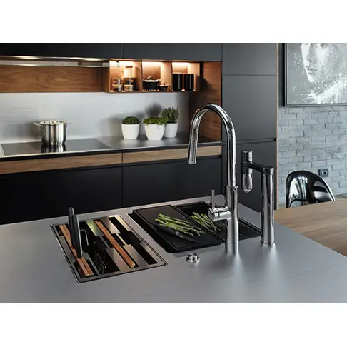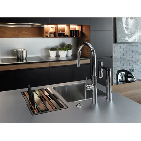 Po raz pierwszy na świecie — filtr, który nie wymaga instalacji podszafkowej, obniża koszty uzdatniania wody i oszczędza miejsce! Ta bateria to jedyny model na rynku z wymienną kapsułką w dodatkowej wylewce. Po prostu wymień kapsułki, gdy woda jest brudna, bez żadnej instalacji. I zaoszczędź miejsce w szafce zlewozmywakowej!