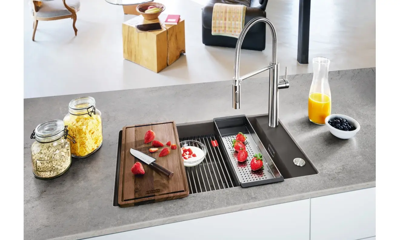 Zlewozmywak wbudowywany z linii Kanon to nowoczesna propozycja, wykonana z ponadczasowego i trwałego surowca - dla miłośników designu i funkcjonalności. Na szczególną uwagę zasługuje wewnętrzna krawędź, która pozwala na komfortowe korzystanie z rollmaty i wkładki ociekowej. Rozwiązania te umożliwiają dwa poziomy pracy, zwiększając tym samym funkcjonalność komory.