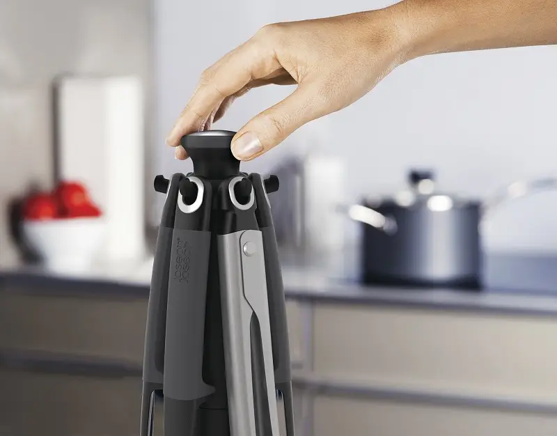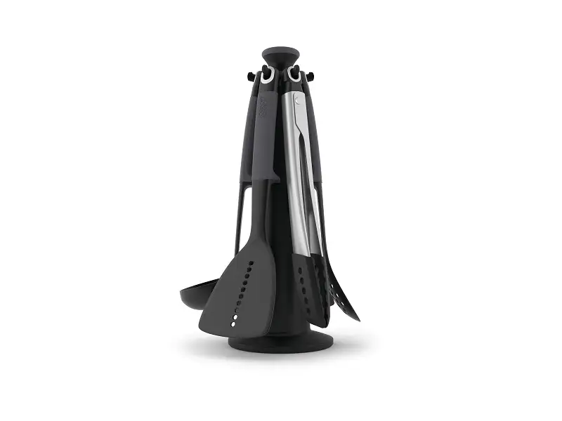 Narzędzia umieszczone są na obrotowym stojaku, dzięki czemu są łatwo dostępne podczas gotowania.