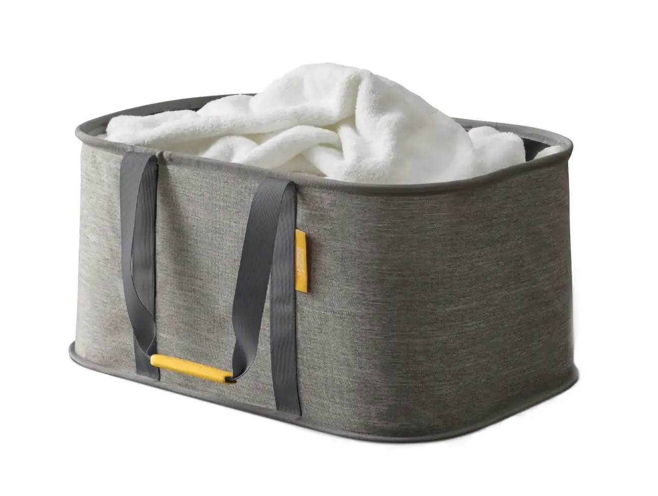 Prezentowany kosz na pranie z linii Hold-All o pojemności 35 L i wymiarach 36 x 53 x 25 cm (gł. x szer. x wys.) wykonany został z poliestru w szarym kolorze. Produkt posiada pojedynczą komorę na ubrania, mogącą znieść obciążenie do 9 kg. Dwa mocne, wygodne do trzymania uchwyty pozwalają na łatwe przenoszenie kosza, a możliwość złożenia sprawia, że można go nie tylko bezproblemowo przechowywać, oszczędzając miejsce, ale i zabrać ze sobą na wyjazd (złożony ma wymiary 36 x 53 x 2 cm (dł. x szer. x wys.)). Produkt umożliwi łatwe trzymanie prania i przenoszenie go z miejsca na miejsce, pomagając przy tym w zachowaniu porządku w domu. W razie konieczności wyczyszczenia z zabrudzeń należy myć go wyłącznie ręcznie, przecierając wilgotną ściereczką.