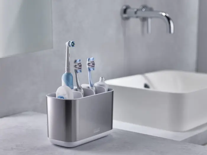 Funkcjonalny szeroki pojemniczek od angielskiej marki Joseph Joseph do przechowywania przyborów łazienkowych takich jak szczoteczki czy pasty do zębów. Pojemniczek został wykonany z wysokiej jakości wytrzymałego tworzywa sztucznego oraz szczotkowanej stali nierdzewnej.
