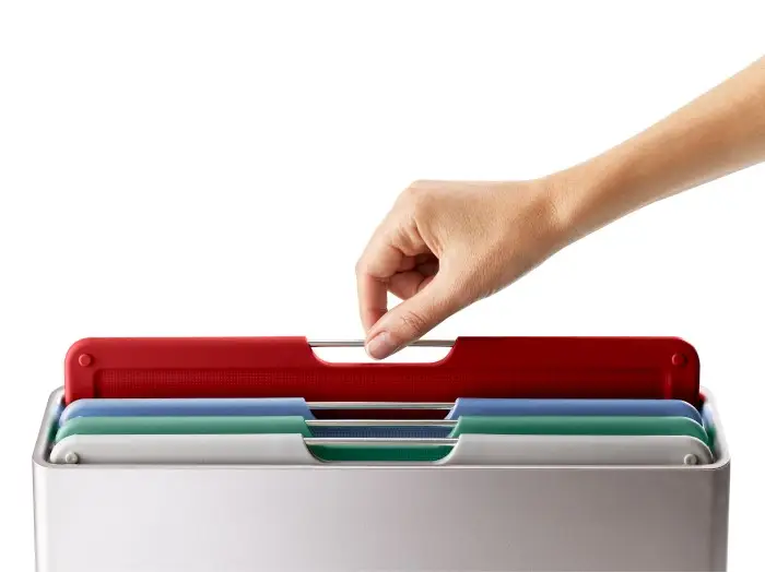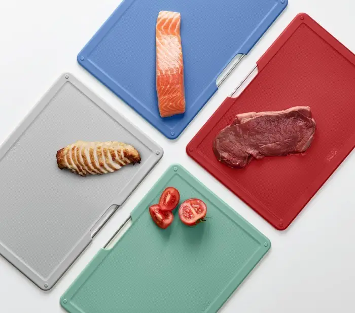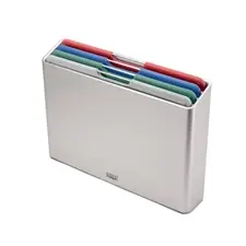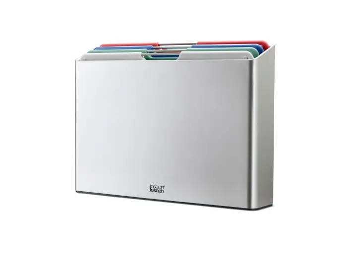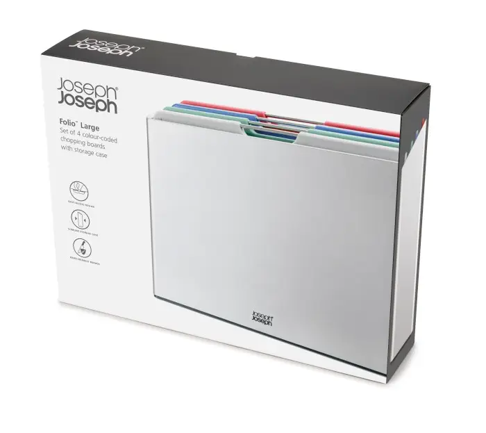 Zestaw Folio marki Joseph Joseph w rozmiarze L zawiera cztery deski w eleganckim organizerze. Teksturowana powierzchnia desek ułatwia krojenie. Posiadają one wygodne, antypoślizgowe nóżki. Cały zestaw świetnie wygląda na kuchennym blacie. Deski należy myć ręcznie, natomiast organizer wystarczy przetrzeć wilgotną ściereczką.