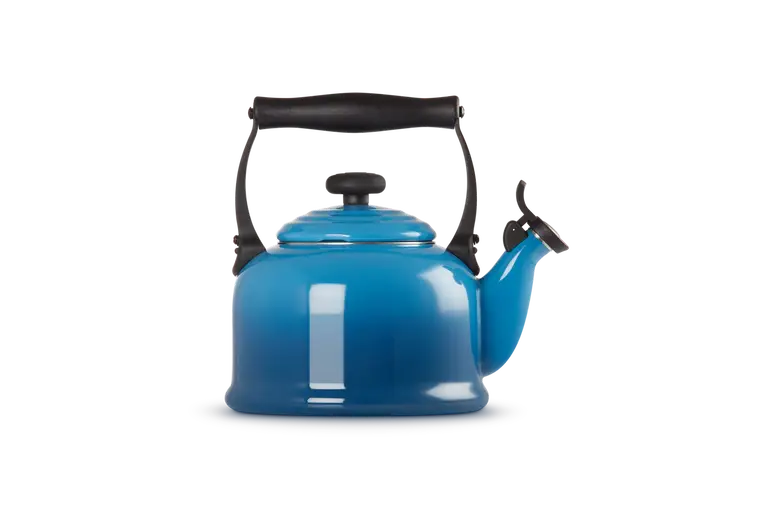Tradycyjny czajnik z gwizdkiem marki Le Creuset wyprodukowany został w Tajlandii. Ma 2,1 litra pojemności. Czajnik ma wyjątkowo trwały spód, który odpowiedni jest również na kuchenki indukcyjne. Naczynie szybko się nagrzewa. Ergonomiczny uchwyt nie nagrzewa się, co ułatwia nalanie wody. Emaliowana stal ma żywe, piękne kolory, które nadadzą Twojej kuchni uroku.