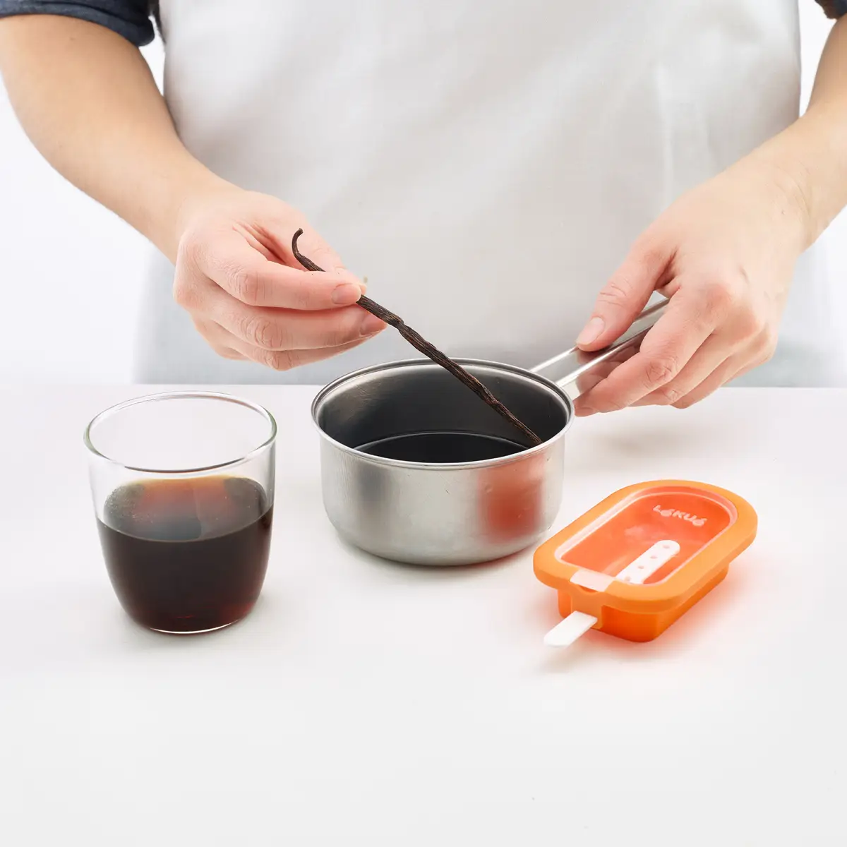W zestawie do robienia lodów na patyku marki Lekue znajdują się cztery formy w różnych kolorach, 4 sztywne przykrywki do zamknięcia pojemników oraz 4 patyki z wytłoczonym logo Lekue. W foremkach można zamrozić sorbet, jogurt, mrożoną herbatę i wiele innych. Tego typu desery są szczególnie polecane dla osób dbających o zdrowy sposób odżywiania i alergików z uwagi na możliwość mrożenia produktów bez laktozy. Dzięki swojej konstrukcji foremki można napełniać, zamykać przykrywką i ustawiać jedna na drugiej oszczędzając miejsce w zamrażarce. Wytrzymuje temperatury od -20 st. C do +100 st. C.