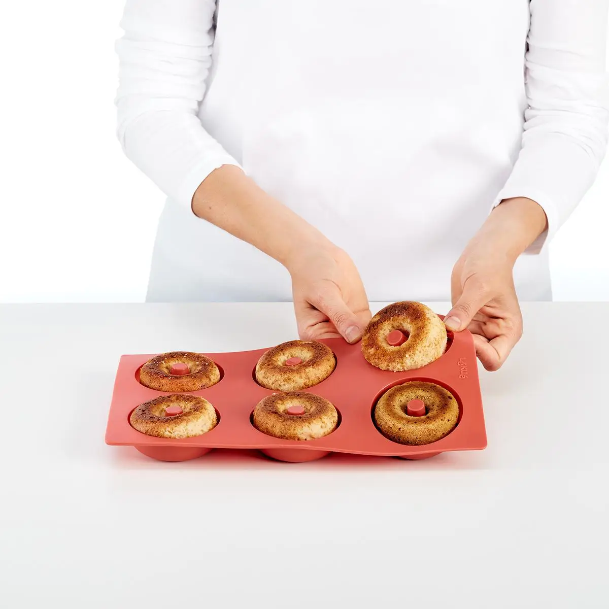 Forma do pieczenia marki Lekue pozwala na upieczenie 6 donutów o charakterystycznym kształcie. Przeznaczona jest do użycia w piekarniku, dzięki czemu deser jest dużo zdrowszą alternatywą niż jego tradycyjna wersja smażona na głębokim tłuszczu. Ze względu na nieprzywieralność materiału jakim jest silikon forma nie wymaga natłuszczania, a upieczone donuty bardzo łatwo się z niej wyjmuje. Posiada wzmocnioną strukturę dzięki czemu jest stabilna, a przenoszenie wypełnionej ciastem formy jest wygodne. Każdy z 6 otworów ma pojemność 90ml oraz wymiary 75 x 25 mm [śr. x wys.]. Forma przystosowana jest do wysokich i niskich temperatur w zakresie od -60°C do +240°C. Formę można wykorzystać również do przygotowania mrożonych deserów lodowych, lub galaretek. Można myć w zmywarce. Książeczka z 5 przepisami (bez języka polskiego) w środku.