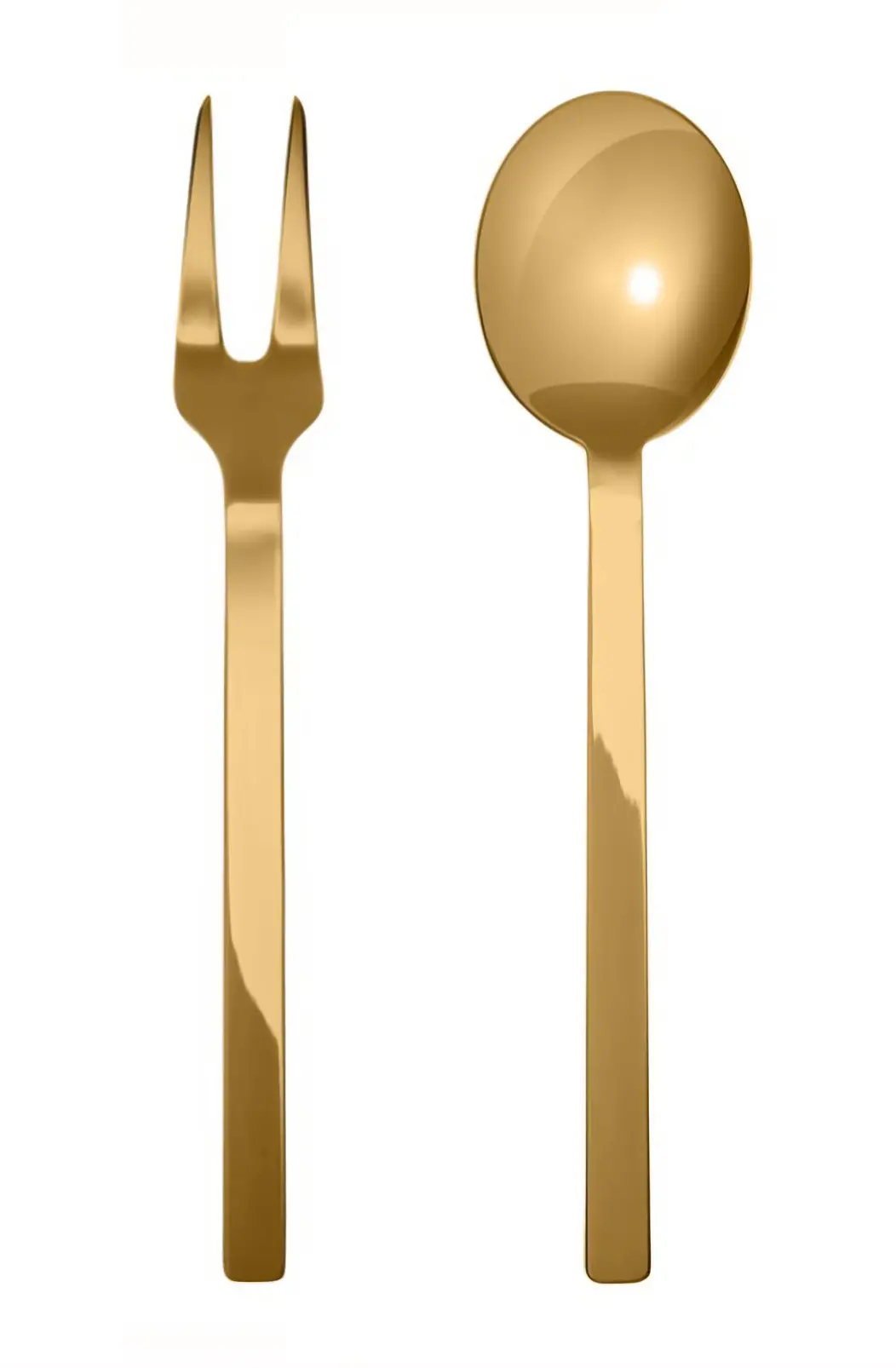 Prezentowany zestaw do serwowania złożony jest z łyżki i widelca, ułatwiającego nałożenie m.in. sałatek. Pudełko prezentowe w które został zapakowany sprawia, że można je kupić na prezent. Sztućce wykonane zostały we Włoszech ze stali nierdzewnej 18/10 i pokryte wykończeniem zapewniającym większą odporność na uszkodzenia, co pozwoli na używanie zestawu przez dłuższy czas. Złoty kolor sprawia, że sztućce elegancko się zaprezentują na stole, uzupełniając zastawę. Zestaw nadaje się do mycia w zmywarce, co ułatwi utrzymanie go w czystości.