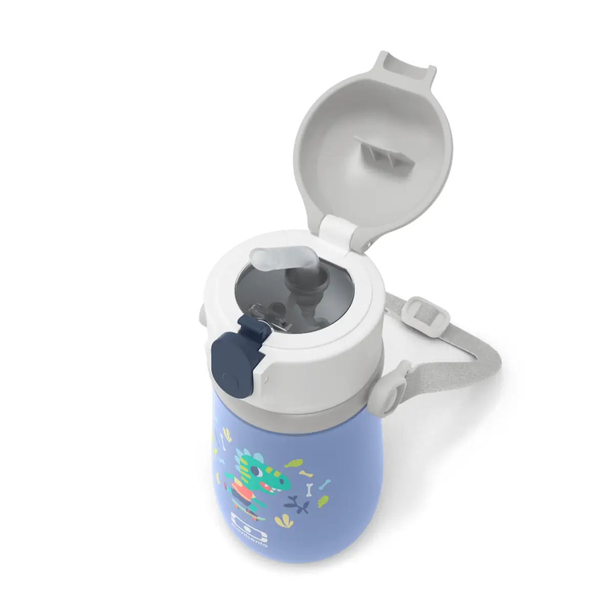 Prezentowana butelka Dino o pojemności 360 ml i niebieskim kolorze ozdobiona została wzorem postaci dinozaura. Jej korpus wykonano ze stali nierdzewnej. Sportowa zakrętka z ustnikiem, w którą została wyposażona butelka, jest nie tylko łatwa w otwieraniu i zamykaniu, ale i pozwala na wygodne spożycie napoju. Baza antypoślizgowa oraz możliwość hermetycznego zamknięcia pomogą w uniknięciu przykrych wypadków w postaci wylania zawartości butelki do wnętrza plecaka czy jej przypadkowego spadnięcia z biurka. Dodatkowo dołączono do niej wyjmowaną słomkę z obciążnikiem. Butelka wyposażona została także w plastikowy uchwyt, którego można używać wymiennie z poliestrowym paskiem, co pozwoli na wygodne noszenie jej w ręce. W celu czyszczenia produkt ten należy myć ręcznie.