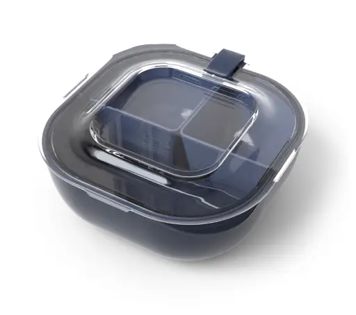 Prezentowany lunchbox Blue Terrazzo o pojemności 0,6 L wykonany został z polipropylenu w kolorach kremowym i niebieskim. Pokrywkę ozdobiono wzorem powstałym we współpracy z Catimini. Silikonowe uszczelki, w które został wyposażony, zapewniają szczelność, dzięki czemu przenoszone w nim kanapki i przekąski nie zabrudzą wnętrza plecaka. Żaden z wykorzystanych do jego produkcji materiałów nie zawiera BPA, co czyni go bezpiecznym dla żywności i zdrowia. Dodatkową zaletą pojemnika jest możliwość jego personalizacji - w komplecie dołączone zostały do niego 4 wymienne obrazki, które można umieścić w pokrywce, co pozwoli na łatwiejszą identyfikację lunchboxu. Pojemnik należy myć ręcznie, co jednak nie powinno sprawić większych problemów.