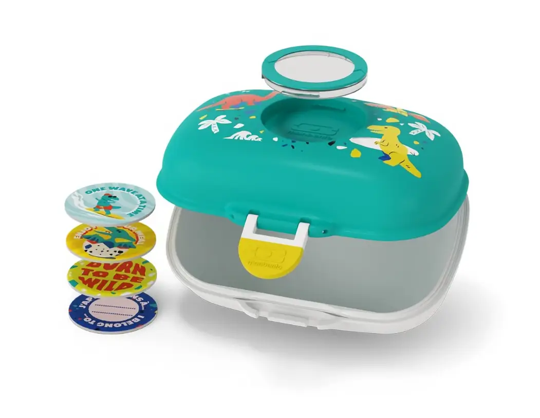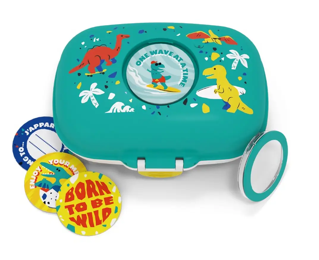Prezentowany lunchbox Graphic Dino o pojemności 0,6 L w turkusowo-białym kolorze ozdobiony został wzorem dinozaurów. Pojemnik wykonano z polipropylenu i posiada on silikonowe uszczelki, zapewniające szczelność. Żaden z wykorzystanych do jego produkcji materiałów nie zawiera BPA, co czyni go bezpiecznym dla żywności i zdrowia. Dodatkową zaletą pojemnika jest możliwość jego personalizacji - w komplecie dołączone zostały do niego 4 wymienne obrazki, które można umieścić w pokrywce, co pozwoli na łatwiejszą identyfikację lunchboxu. Pojemnik należy myć ręcznie, co jednak nie powinno sprawić większych problemów.