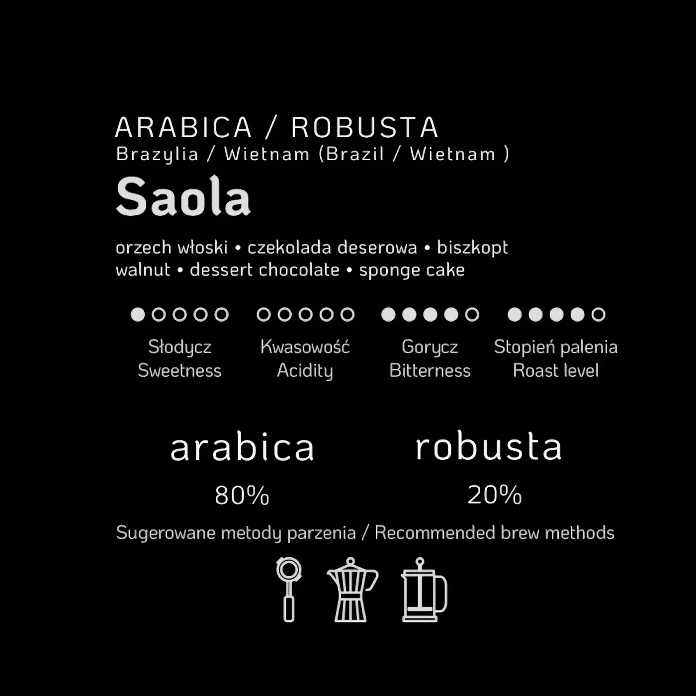 Prezentowana kawa ziarnista Saola powstała z mieszanki ziaren arabica (80%) oraz robusta (20%) pochodzących z upraw w Brazylii i Wietnamie. W smaku wyróżniają ją nuty orzechów, czekolady i biszkoptów. Kawa doskonale sprawdzi się na chwilę wytchnienia od obowiązków czy pracy, swoją mocą i wyjątkowym smakiem zapewniając nastrój i energię na resztę codziennych wyzwań. Można ją także będzie przygotować w łagodniejszej wersji np. cappuccino. Świetnie sprawdzi się również spożywana w gronie znajomych, zaskakując ich swoją unikalnością.