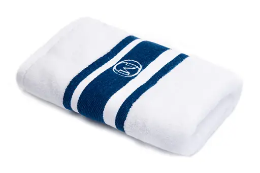 Prezentowany ręcznik kąpielowy z linii Linea ma wymiary 100 x 160 cm i gramaturę 650 gr/m2. Idealnie sprawdzi się na co dzień, podnosząc komfort kąpieli. Wykonano go z białej, odwójnie czesanej, wstępnie pranej bawełny frotte z żakardowymi paskami w aksamitnym splocie chenille w kolorze niebieskim. Ręcznik posiada wszytą pętelkę do zawieszania w tym samym kolorze, która ułatwia przechowywanie na haczyku w łazience. Podwójne przeszycia i zamknięte rogi zapobiegają natomiast szybkiemu niszczeniu.