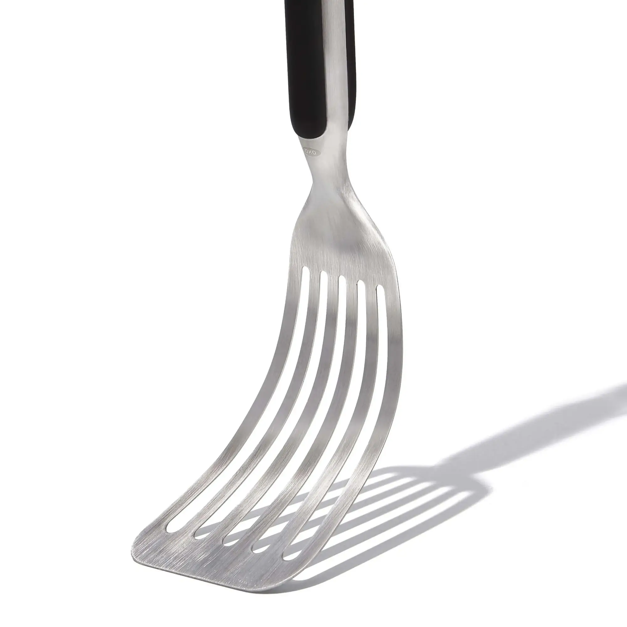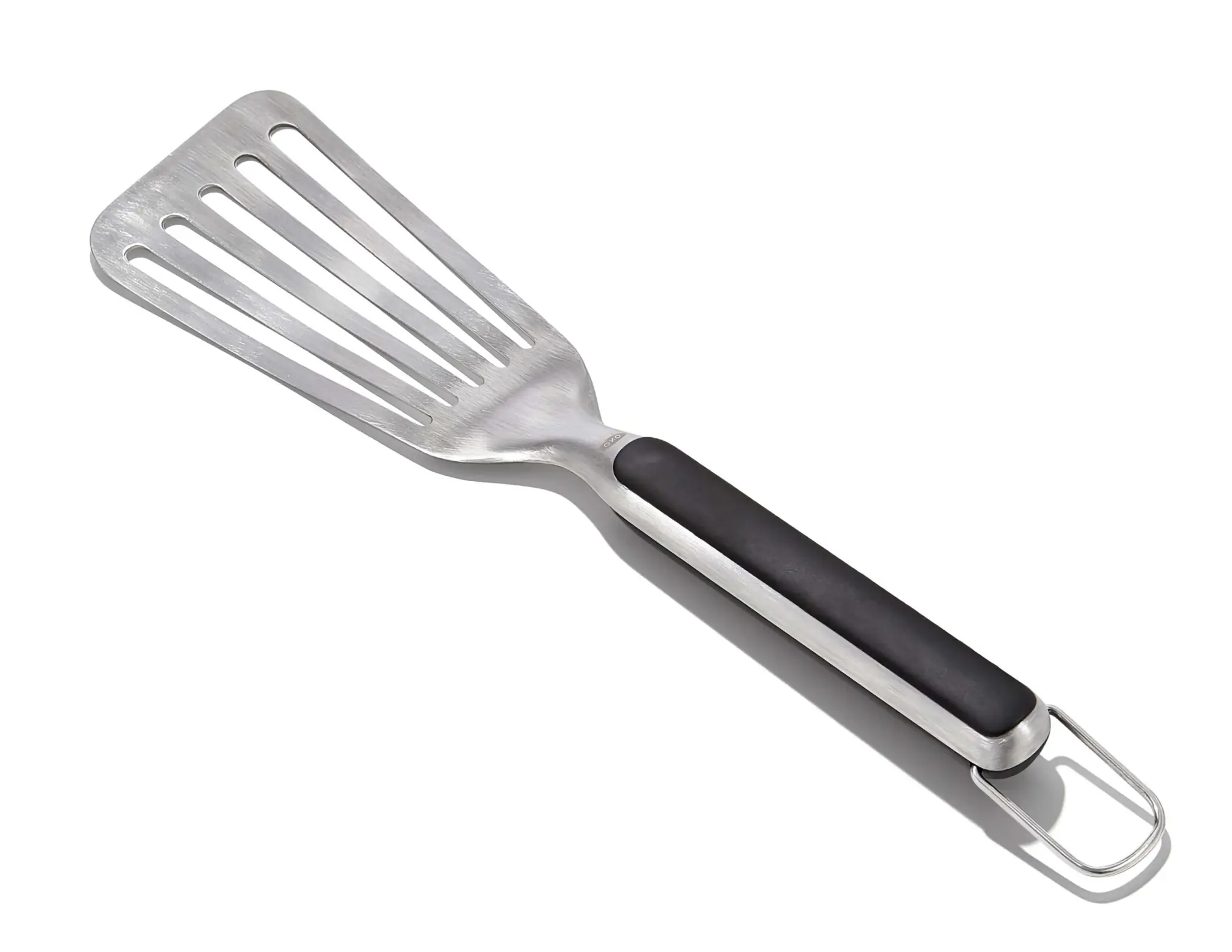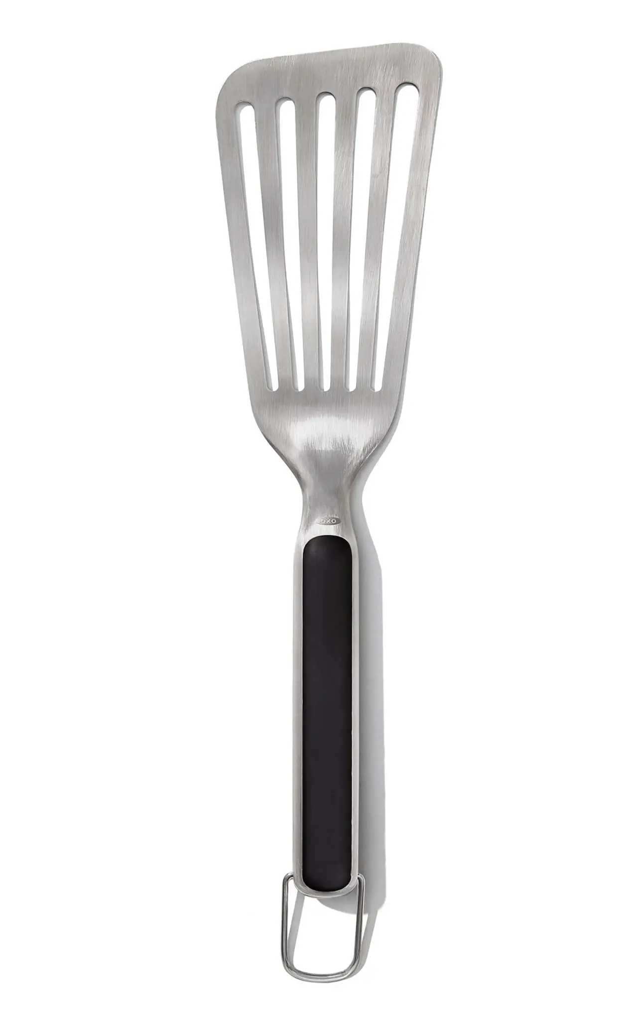 Prezentowana łopatka do grillowania Good Grips świetnie sprawdzi się m.in. do obracania steków czy mieszania warzyw na tackach. Specjalna konstrukcja ułatwi również przenoszenie ich na talerze. Cienka, elastyczna głowica łopatki z łatwością wsunie się nawet pod najcieńsze kawałki żywności. Otwory w jej powierzchni odprowadzą przy tym nadmiar tłuszczu. Jednocześnie głowica jest trwała i odporna na korozję - wykonana została ze stali nierdzewnej, prawidłowo używana swoje zadania spełniać będzie przez lata. Łopatka posiada również ergonomiczną rączkę, która dzięki antypoślizgowej warstwie pewnie leżeć będzie w dłoni. Dodatkową zaletą jest także umieszczony na końcu uchwytu nieduży pierścień do zawieszania, który ułatwi jej przechowywanie oraz umożliwi zawieszenie na grillu, by była łatwo dostępna. Ponadto produkt nadaje się do mycia w zmywarce.