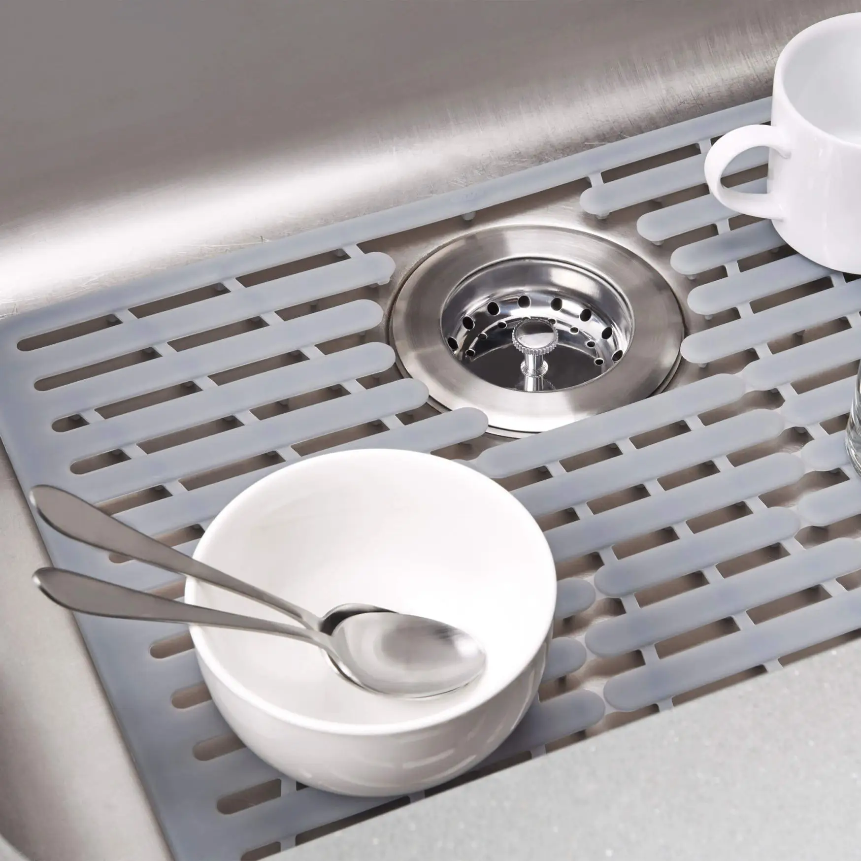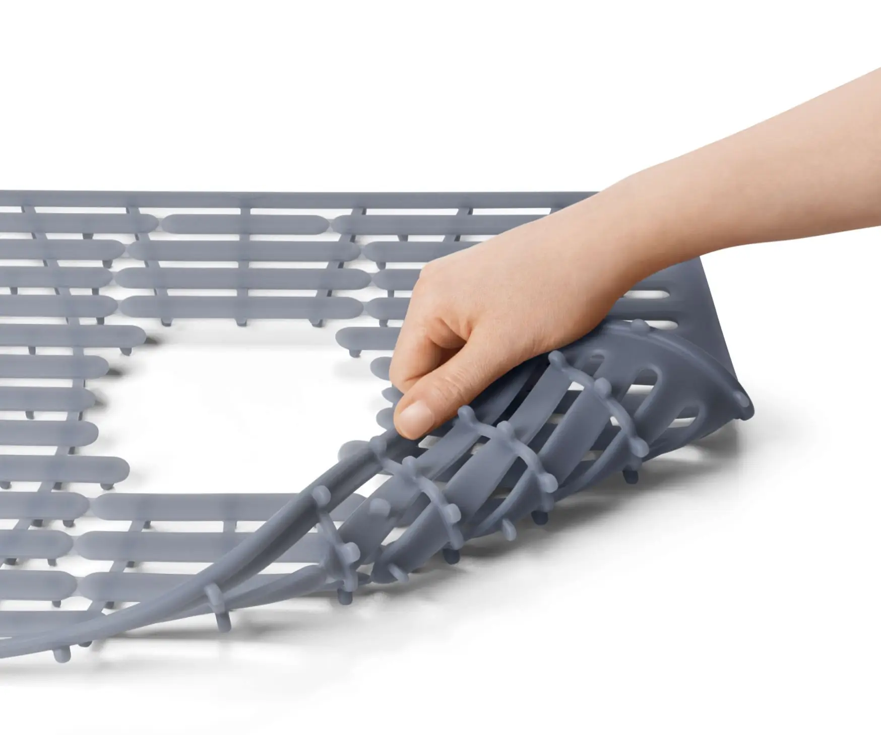 Prezentowana mata o wymiarach 32 x 41 cm i neutralnym szarym kolorze doskonale odnajdzie się w każdej kuchni, umożliwiając bezpieczne umieszczanie naczyń w zlewie, nawet gdy te będą jeszcze gorące - jest ona odporna na temperaturę do 220 stopni Celsjusza. Antypoślizgowa powierzchnia sprawi, że nie będą się one niekontrolowanie przesuwać po komorze, co uchroni delikatniejsze z nich przed stłuczeniami lub innymi uszkodzeniami. Specjalne szczeliny w połączeniu z niewielkimi wypustkami na jej spodniej stronie umożliwiają swobodny przepływ wody i powietrza. Dodatkowo produkt został tak zaprojektowany żeby można w nim było w razie potrzeby wyciąć otwór wokół odpływu - trzy przeznaczone do tego miejsca pozwalają na dopasowanie jego pozycji do tej w posiadanym zlewie. Zaletą maty jest również łatwość w utrzymaniu jej w czystości - resztki jedzenia można będzie z łatwością usunąć myjąc matę w zmywarce.