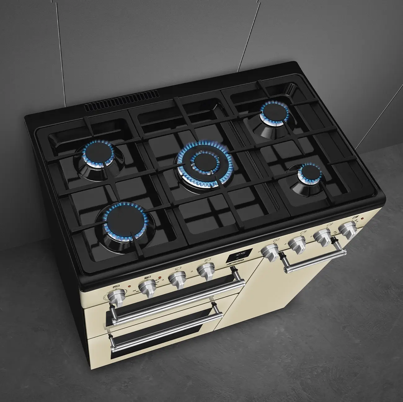 Smeg CX93GMCR to kremowa kuchnia wolnostojąca z serii Classica, która łączy klasyczny design z profesjonalnymi możliwościami. Szerokość 90 cm, trzy niezależne piekarniki oraz 5-palnikowa płyta gazowa sprawiają, że urządzenie to spełni wymagania najbardziej wymagających użytkowników. Czarna płyta z żeliwnymi rusztami i palnik Ultra-Rapid o mocy 4,0 kW gwarantują moc i stabilność podczas gotowania.