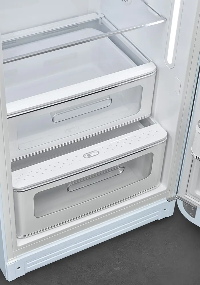 Lodówka Smeg z niepowtarzalnej linii produktów Retro 50’s to propozycja dla wszystkich miłośników dobrej kuchni i stylistyki typu Retro. Wyjątkowo piękny design nawiązujący do lat 50-tych ubiegłego wieku pozwala przenieść się w tamte czasy i stworzyć unikalny wystrój swojej stylowej kuchni. Lodówka posiada chromowany uchwyt i logo.