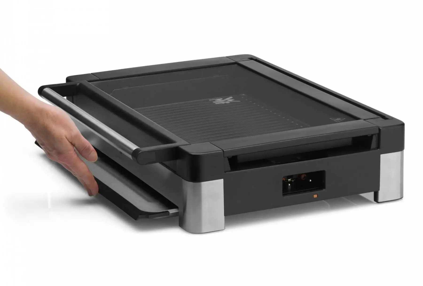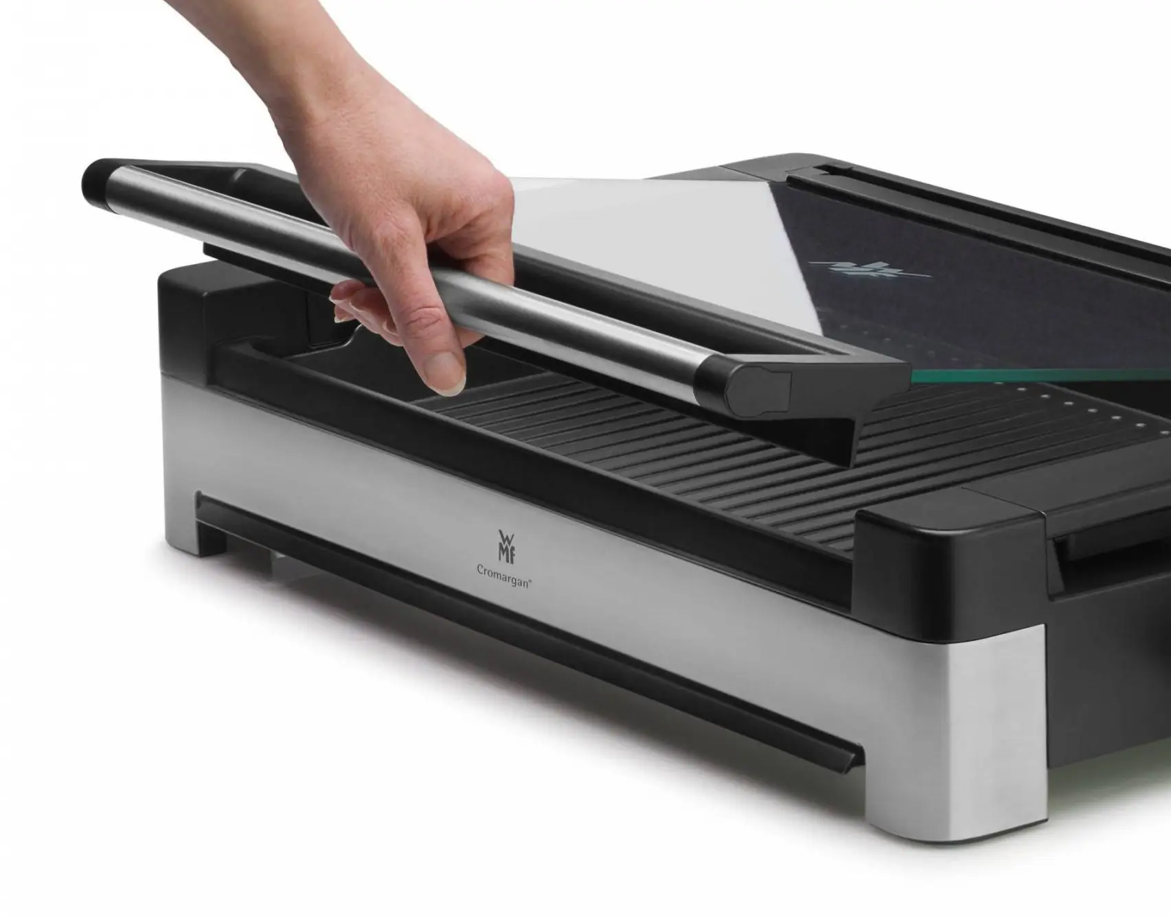 Stołowy grill elektryczny marki WMF to produkt idealny dla osób chcących cieszyć się pysznymi potrawami z grilla niezależnie od pogody czy pory roku. Dzięki mocy 2200 W przygotowywane na nim mięso, ryby czy warzywa, będą smaczne i aromatyczne. W dodatku ze względu na brak użycia węgla, potrawy na nim przygotowane są zdrowsze niż z grilla tradycyjnego.