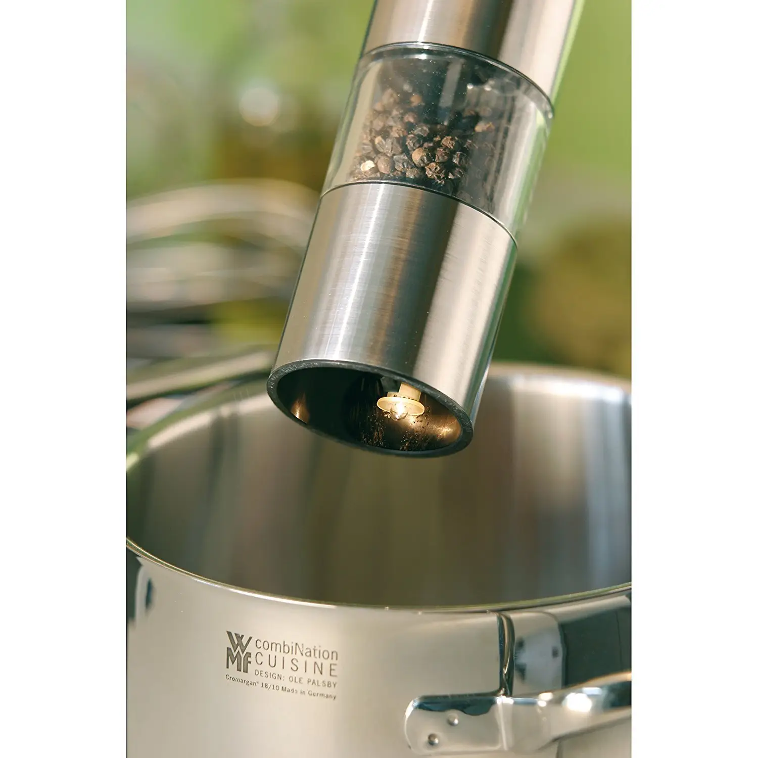 Młynek elektryczny WMF to efektowny sposób doprawienia każdej potrawy. Wykonany z wysokiej jakości stali nierdzewnej Cromargan® będzie się wspaniale prezentował przez długi czas. Dzięki takiemu dodatkowi nie musimy się martwić, że podniebienia naszych gości nie zostaną zaspokojone. Został wyposażony w ceramiczny mechanizm mielący oraz płynną regulację stopnia zmielenia. Młynek jest niezwykle funkcjonalny i łatwy w obsłudze.