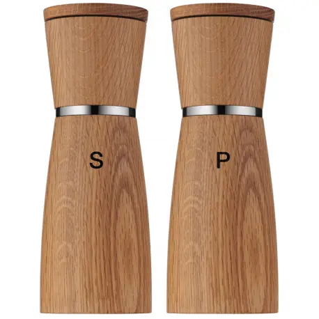 Młynki do soli (S) i pieprzu (P) WMF Nature to wyjątkowe połączenie estetyki i funkcjonalności. Korpusy młynków wykonane są z drewna dębowego z opaską z wysokiej jakości stali nierdzewnej Cromargan®. Wyposażone są w ceramiczne żarna, które charakteryzują się wysoką trwałością, odpornością na korozje i neutralnością na smak i zapach mielonych przypraw. Dodatkowo młynki posiadają płynną regulację grubości mielenia, dzięki czemu można ją dostosować do rodzaju stosowanych przypraw oraz własnych preferencji kulinarnych.