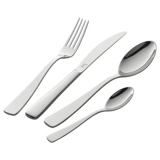 Charakterystyczne dla serii sztućców KING są wygięte ku górze uchwyty i delikatnie zakrzywiona linia, co sprawia że nadają się one na każdą okazję. Oferowany zestaw obiadowy oraz kawowy dla 6 osób prezentuje się szczególnie elegancko, dzięki polerowanej na wysoki połysk powierzchni i zaokrąglonym krawędziom, dlatego też doskonale sprawdzi się dla osób chcących ugościć swoich gości z szykiem i elegancją. Ponadto wszystkie jego elementy wykonano z doskonałej stali nierdzewnej 18/10, a noże wykute zostały z pojedynczych bloków.