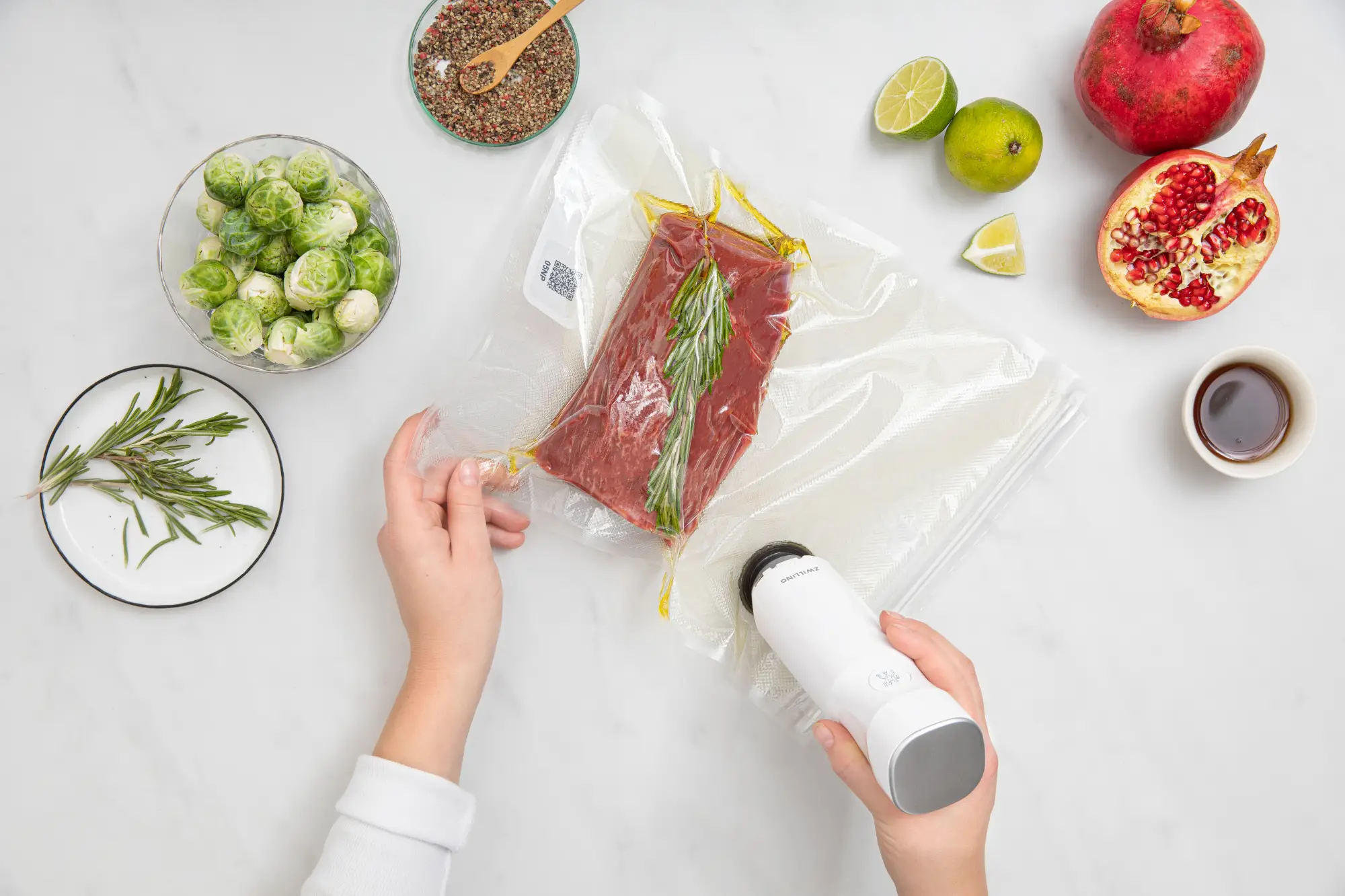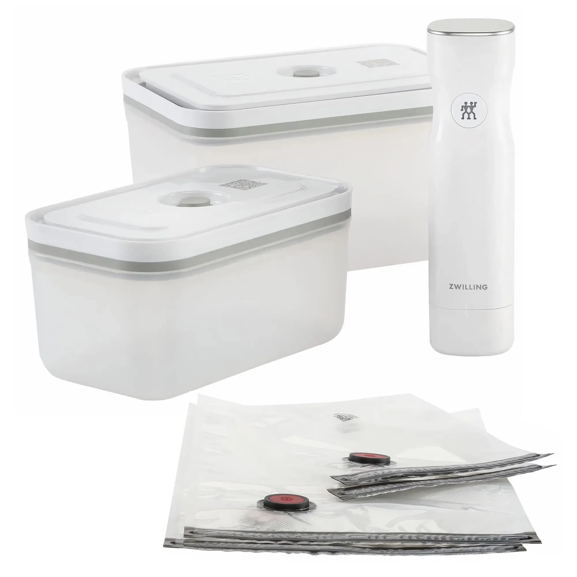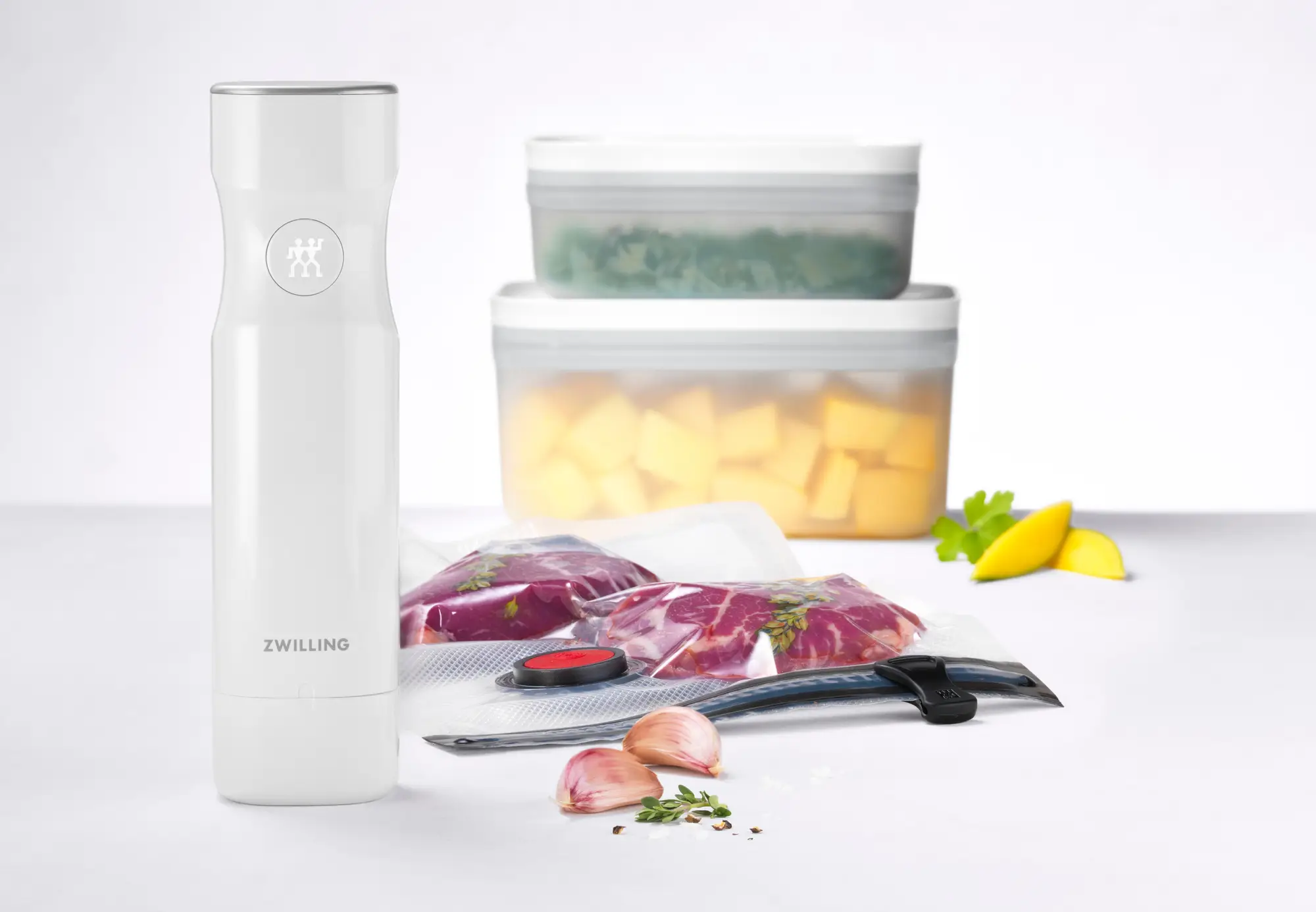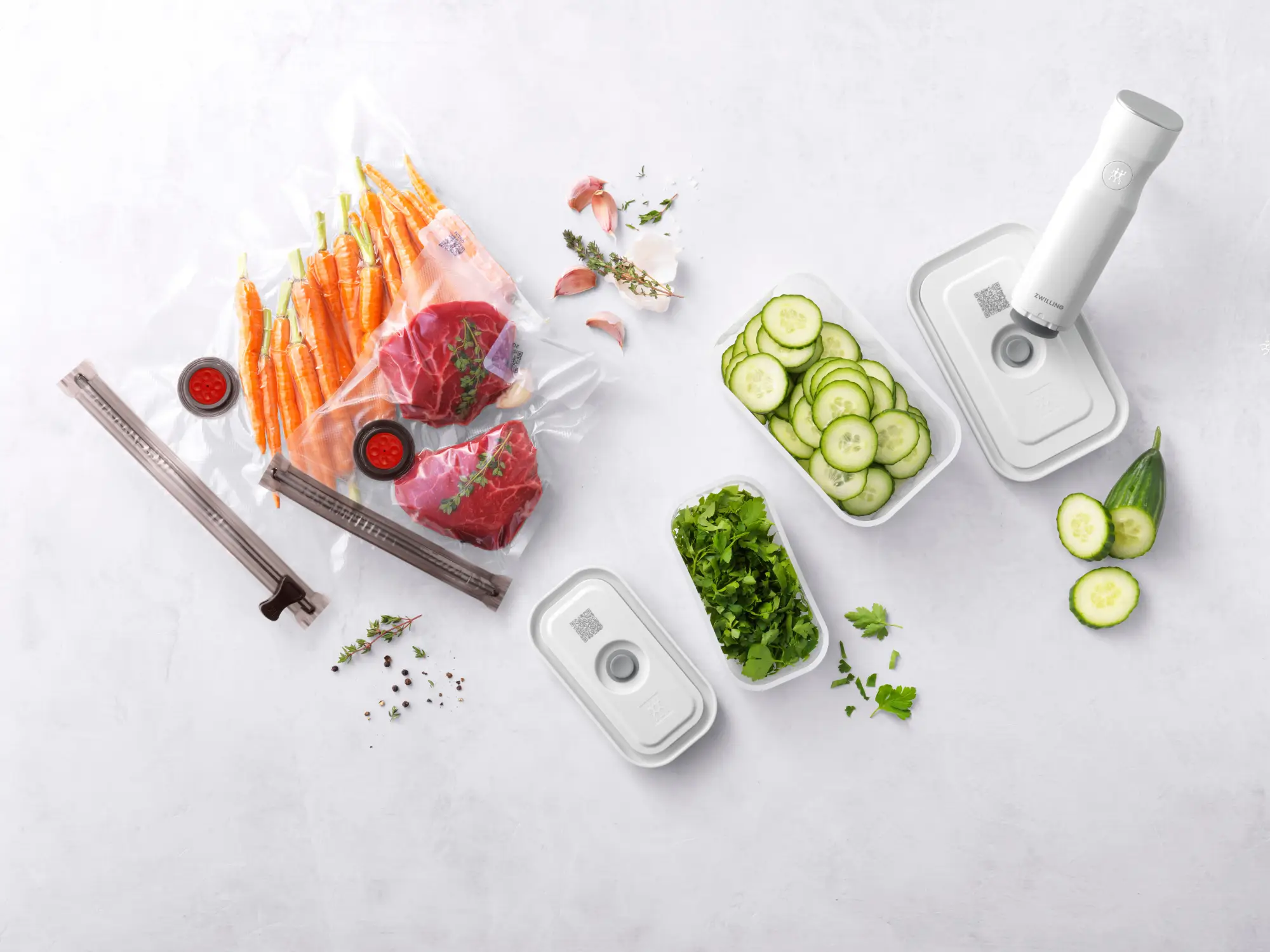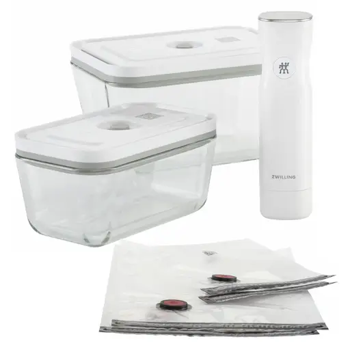 Zestaw składa się z pompy próżniowej, dwóch torebek próżniowych oraz dwóch pojemników z tworzywa sztucznego w rozmiarach M i L. Pojemniki próżniowe nadają się do zamrażarki, zmywarki jak i kuchenki mikrofalowej. Torebki, poza tym, że również mogą być stosowane w zamrażarce i mikrofalówce, doskonale sprawdzą się do gotowania sous-vide w temperaturze do 100°C.