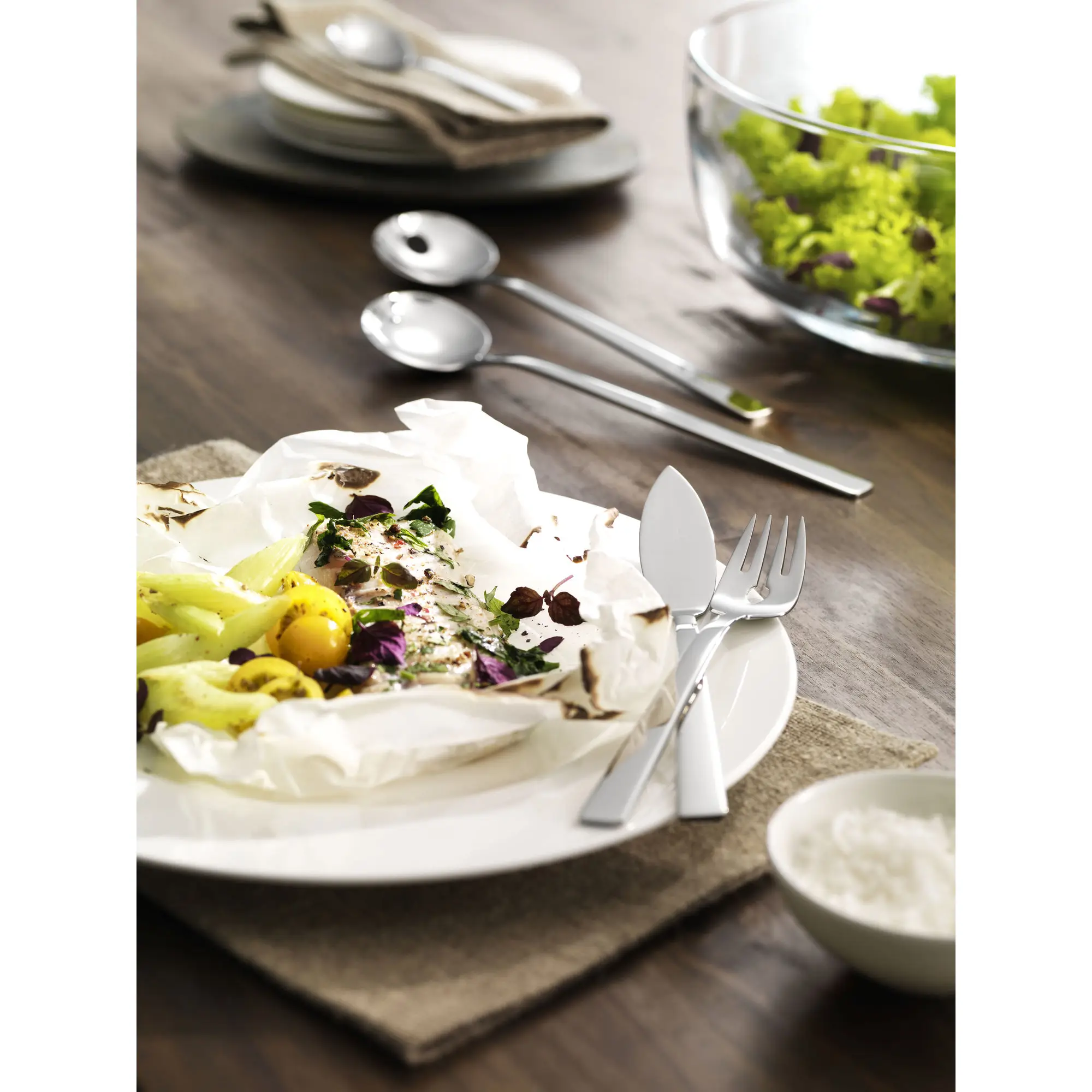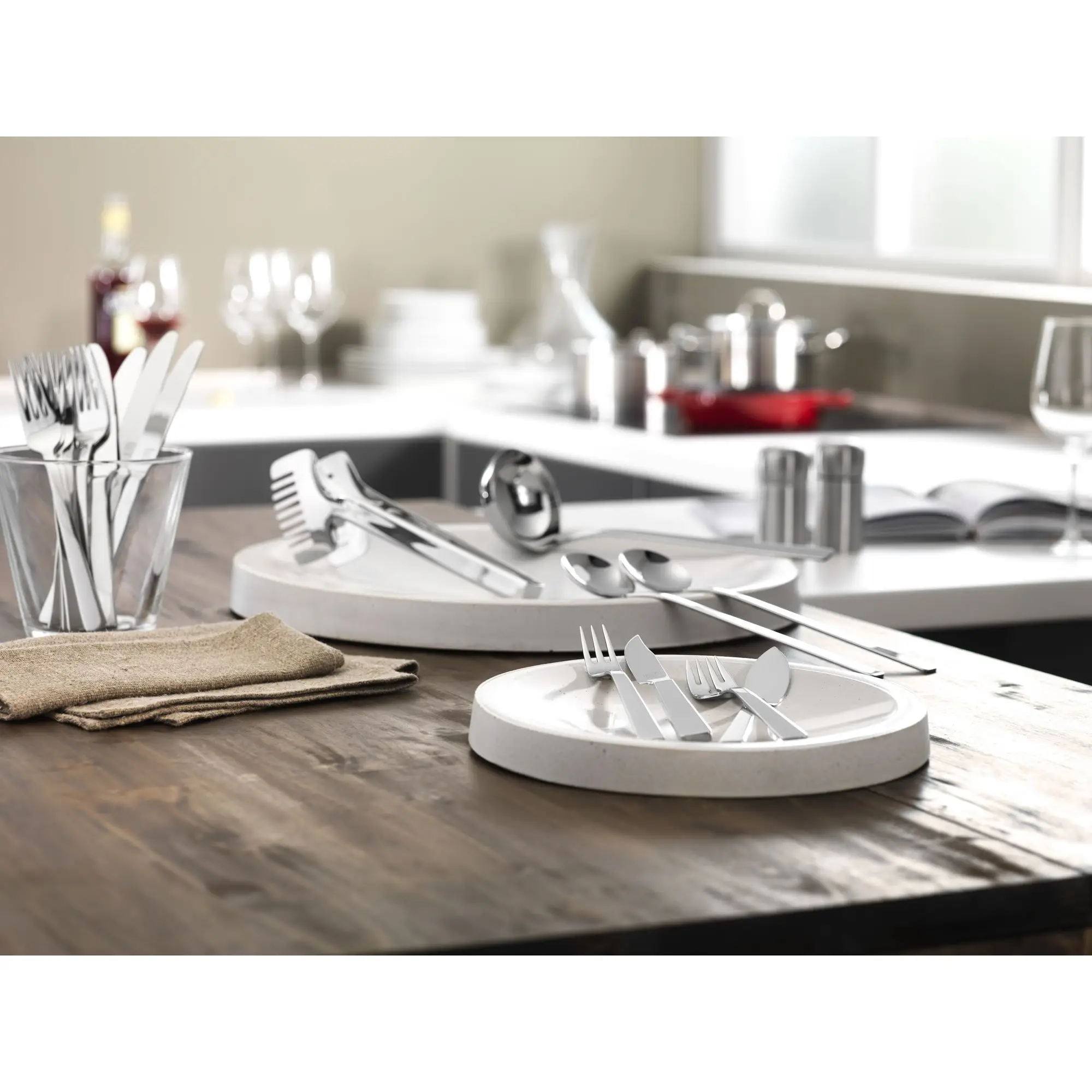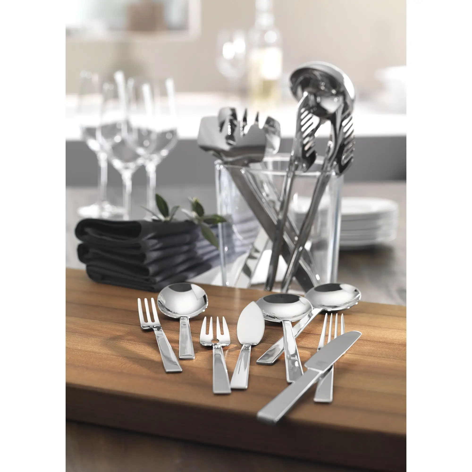 W skład zestawu wchodzą: sztućce obiadowe i kawowe dla 12 osób ( łyżka stołowa, widelec, nóż obiadowy, łyżeczka do kawy i herbaty, widelec do ciasta), a także: chochelka do zup, łyżka do nalewania sosów, łyżeczka do cukru, łopatka do tortów, dwa widelce do mięsa oraz dwie łyżki do serwowania. Wszystkie sztućce wykonane zostały z najwyższej jakości stali nierdzewnej 10/18. Nadają się do mycia w zmywarce.