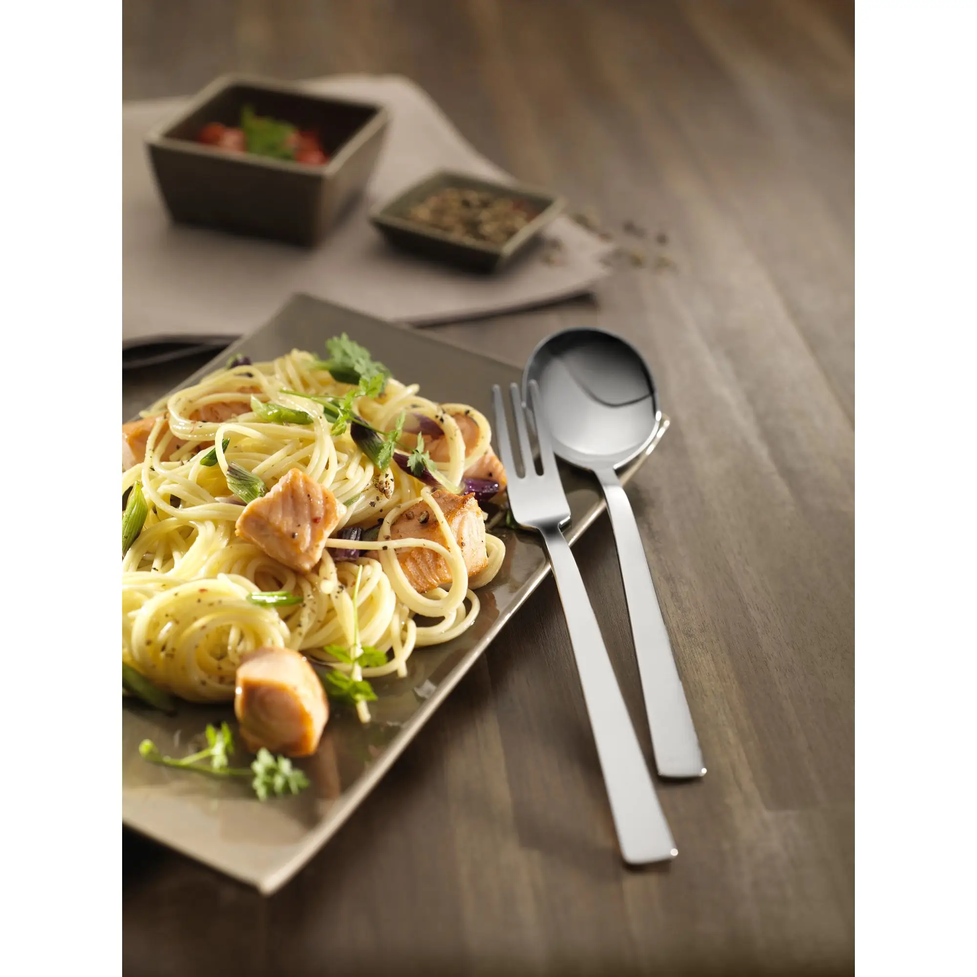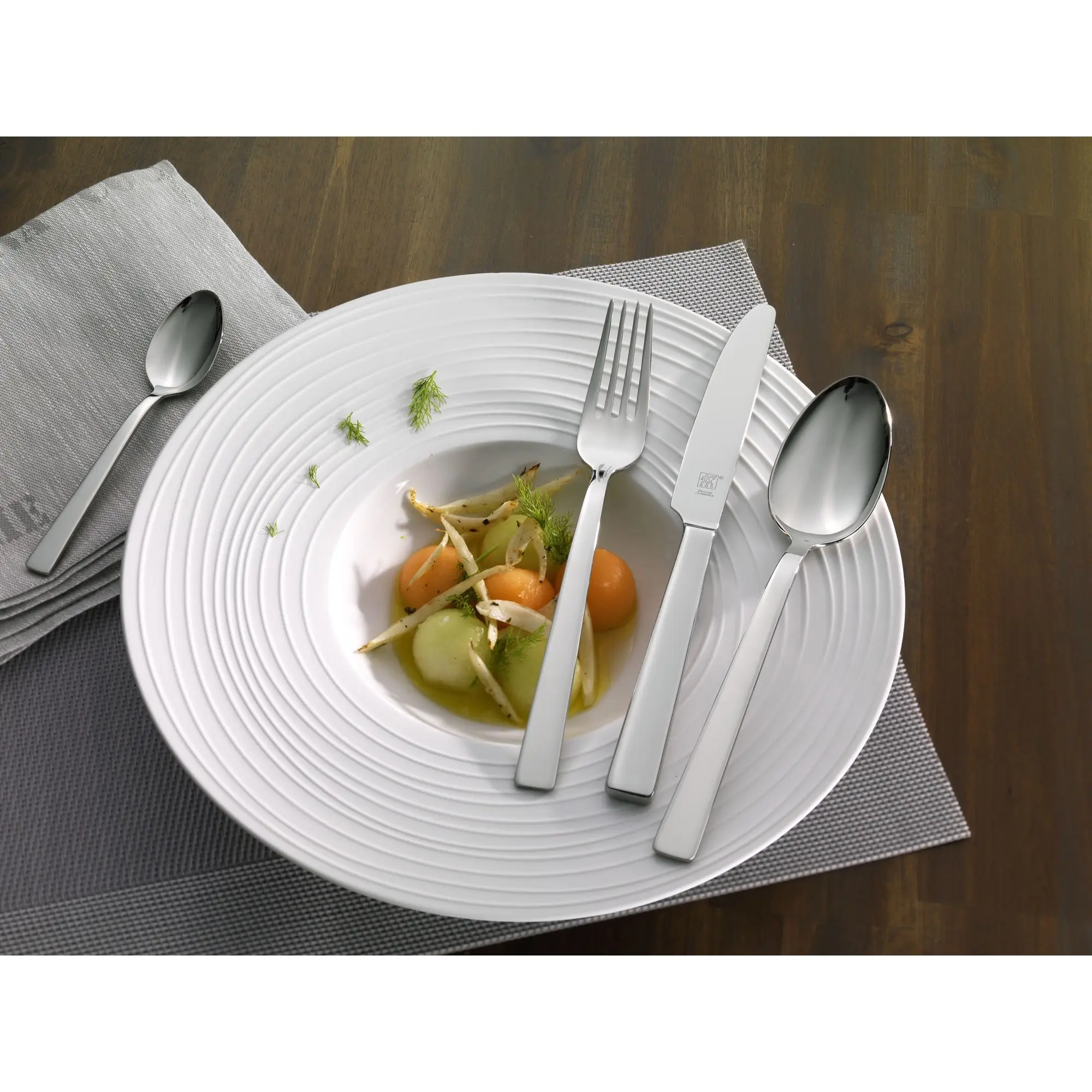 Ten stylowy i funkcjonalny zestaw sztućców świetnie prezentuje się w otoczeniu każdej zastawy stołowej. Jest niezastąpionym dodatkiem każdego wystawnego przyjęcia lub obiadu w większym gronie. Przeznaczony jest dla 12 osób. Całość zapakowana jest w eleganckie pudełko, wyposażone w specjalnie wyprofilowane gniazdka na sztućce.