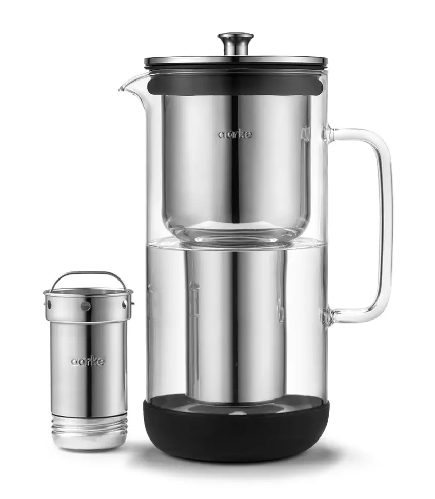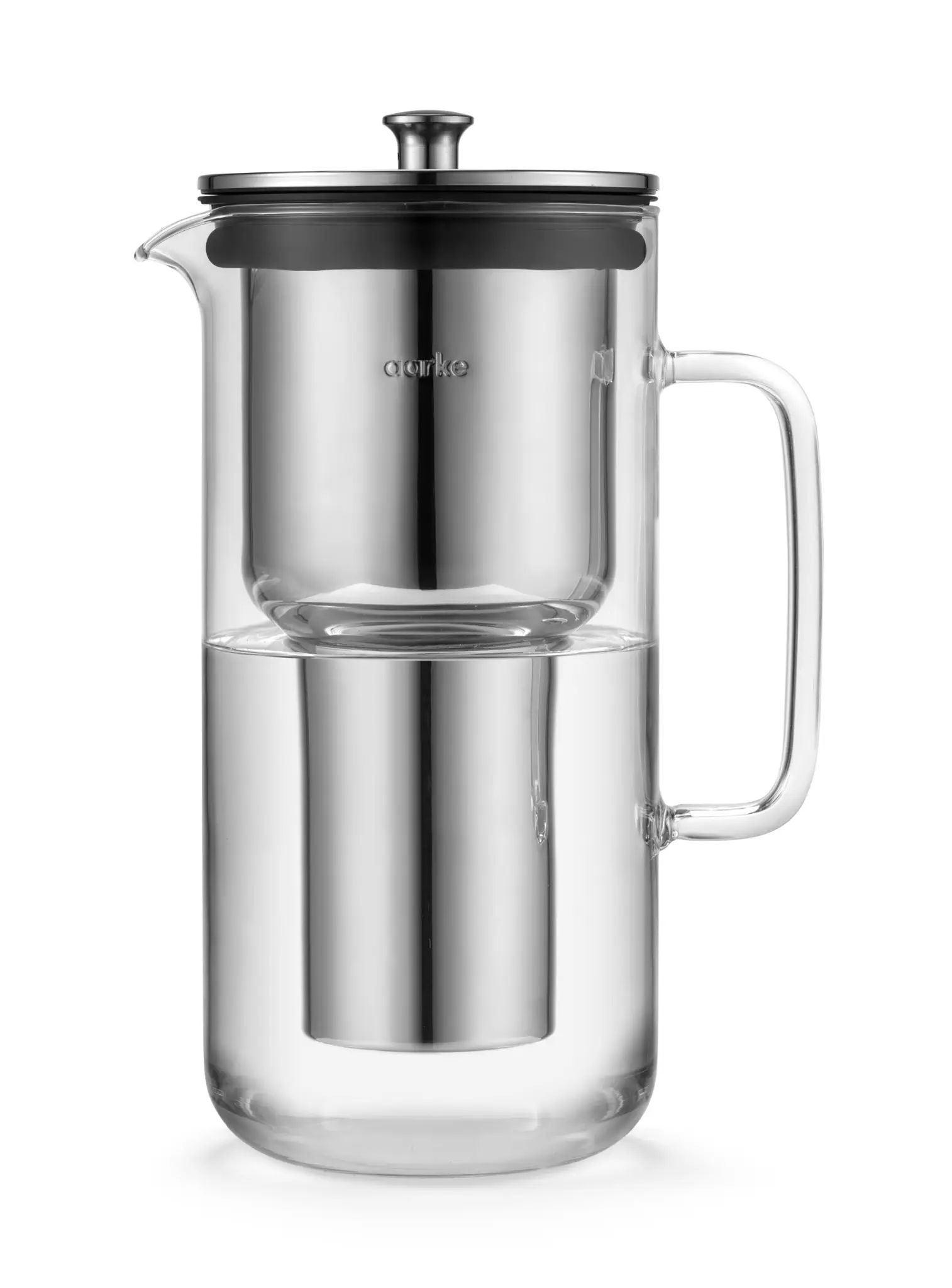 Dzbanek filtrujący Aarke o pojemności 1,18 L i wymiarach 12 x 17,1 x 27,5 cm (śr. x szer. x wys.) to opatentowany, wysokiej jakości produkt wykonany ze szkła, tworzywa sztucznego bez BPA i stali nierdzewnej. Wykorzystany w nim Ocean Bound Plastic to certyfikowane tworzywo sztuczne pochodzące z recyklingu, wykonane z odpadów tworzyw sztucznych, które mogą trafić do oceanu – zebranych w pobliżu wybrzeży, rzek i dróg wodnych lub ze zużytego sprzętu połowowego.