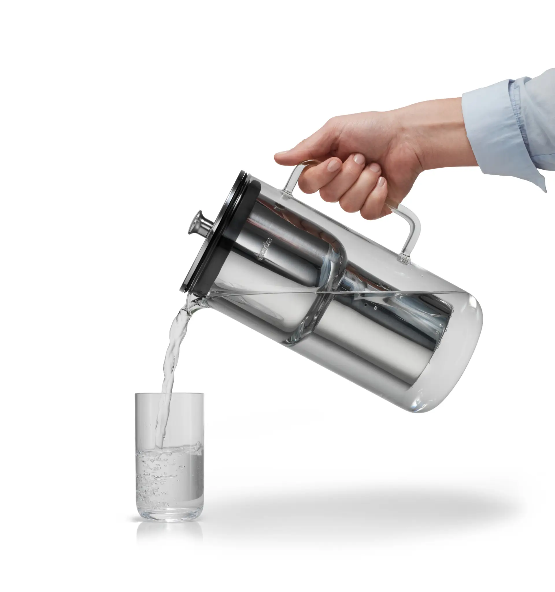 Prezentowany dzbanek posiada unikalny wkład z systemem ReFilter™ z możliwością ponownego napełniania oraz filtr Pure w postaci granulek (w komplecie 1 szt granulatu filtrującego Aarke Pure), które redukują chlor i metale ciężkie oraz kamień – dzięki czemu masz czystszą i smaczniejszą wodę. Granulat wsypuje się do wkładu filtra i można go używać przez 4 tygodnie lub na 120 litrów przefiltrowanej wody. Po tym czasie granulki należy wyrzucić do odpadów domowych, umyć wkład filtrujący i napełnić nowym granulatem. Dzbanek wyposażono również w unikalną pokrywkę z ręcznym wskaźnikiem wymiany filtra, która umożliwia filtrowanie podczas nalewania (czas filtracji: 3-5 minut na litr) oraz zdejmowany silikonowy zderzak pomagający chronić szklaną karafkę. Aby ułatwić utrzymanie go w czystości dostosowano go do mycia w zmywarce w temperaturze do 60°C (filtr należy przed myciem opróżnić z granulatu). W przypadku nieposiadania zmywarki wkład filtrujący można wygotować we wrzącej wodzie przez 3 minuty, a dzbanek wyczyść ciepłą wodą, płynem do mycia naczyń i gąbką. Pozostałości kamienia można usunąć za pomocą środków do usuwania kamienia (nie należy używać wełny stalowej). Ze względów higienicznych i 100% bezpieczeństwa zaleca się czyścić produkt przynajmniej raz w tygodniu. Dzbanek i jego elementy są zaprojektowane i wyprodukowane z materiałów i komponentów, które można poddać recyklingowi i ponownie wykorzystać.
