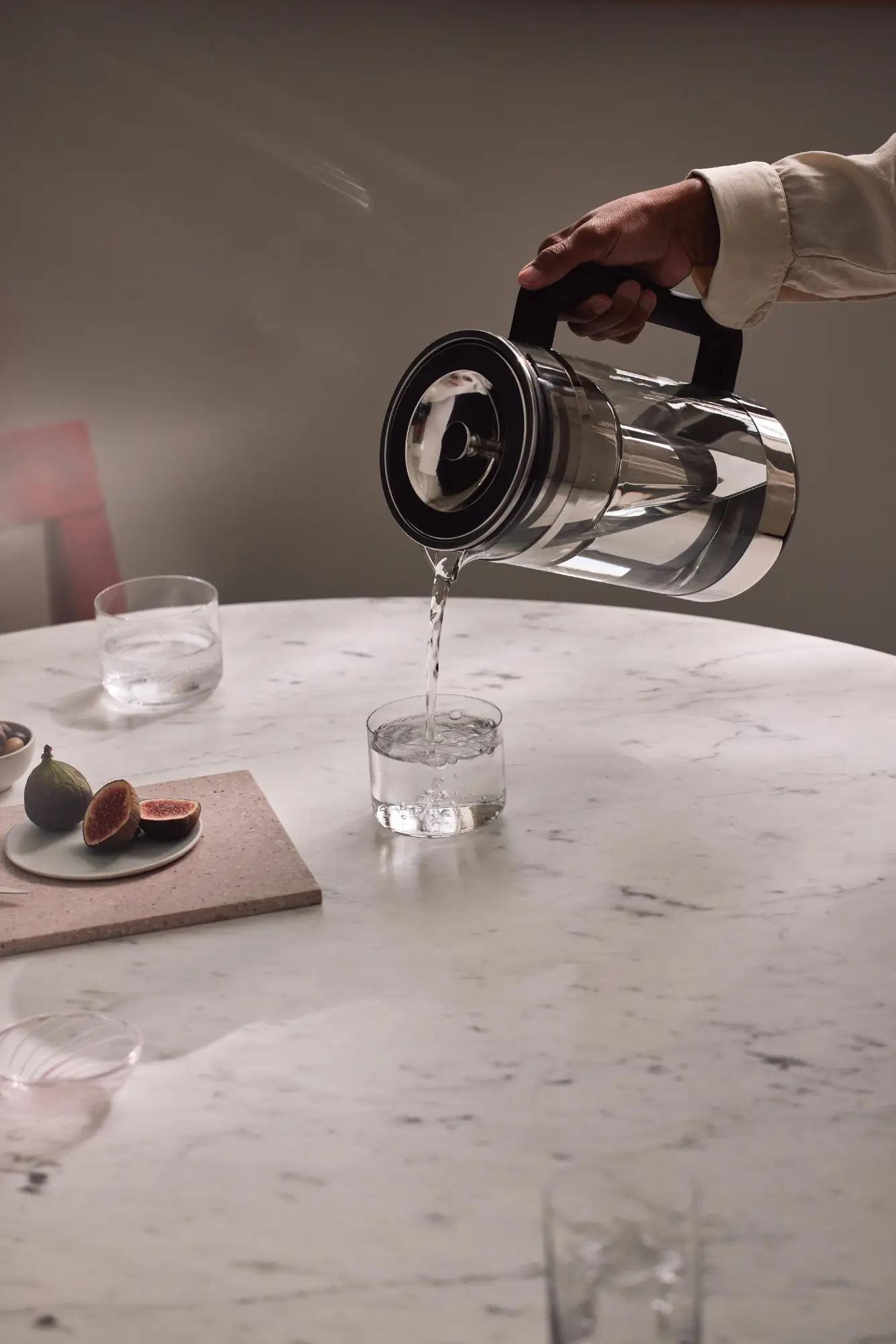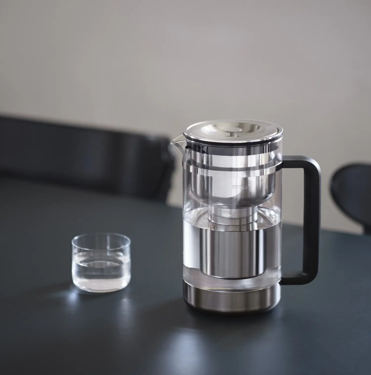 Dzbanek posiada wkład ze stali nierdzewnej z systemem ReFilter™ z możliwością ponownego napełniania. Granulki Pure (w komplecie 1 szt granulatu filtrującego Aarke Pure) redukują chlor i metale ciężkie oraz kamień – dzięki czemu przefiltrowana woda jest czystsza i smaczniejsza. Granulat wsypuje się do wkładu filtra i można go używać przez 4 tygodnie lub na 120 litrów przefiltrowanej wody. Po tym czasie granulki należy wyrzucić do odpadów domowych, umyć wkład filtrujący i napełnić nowym granulatem. Produkt posiada unikalną wklęsłą pokrywkę ze wskaźnikiem wymiany filtra, która umożliwia filtrowanie podczas nalewania (czas filtracji: 3-5 minut na litr) oraz zdejmowany silikonowy zderzak pomagający chronić szklaną karafkę. Ze względu na duży rozmiar, dzbanek został wyposażony również w solidny uchwyt wykonany z przetworzonego plastiku Ocean Bound. Aby ułatwić utrzymanie go w czystości dostosowano go do mycia w zmywarce w temperaturze do 60°C (filtr należy przed myciem opróżnić z granulatu). W przypadku nieposiadania zmywarki wkład filtrujący można wygotować we wrzącej wodzie przez 3 minuty, a dzbanek wyczyść ciepłą wodą, płynem do mycia naczyń i gąbką. Pozostałości kamienia można usunąć za pomocą środków do usuwania kamienia (nie należy używać wełny stalowej). Ze względów higienicznych i 100% bezpieczeństwa zaleca się czyścić produkt przynajmniej raz w tygodniu. Dzbanek i jego elementy są zaprojektowane i wyprodukowane z materiałów i komponentów, które można poddać recyklingowi i ponownie wykorzystać. Można go przechowywać na półce lodówki o wysokości powyżej 25 cm.