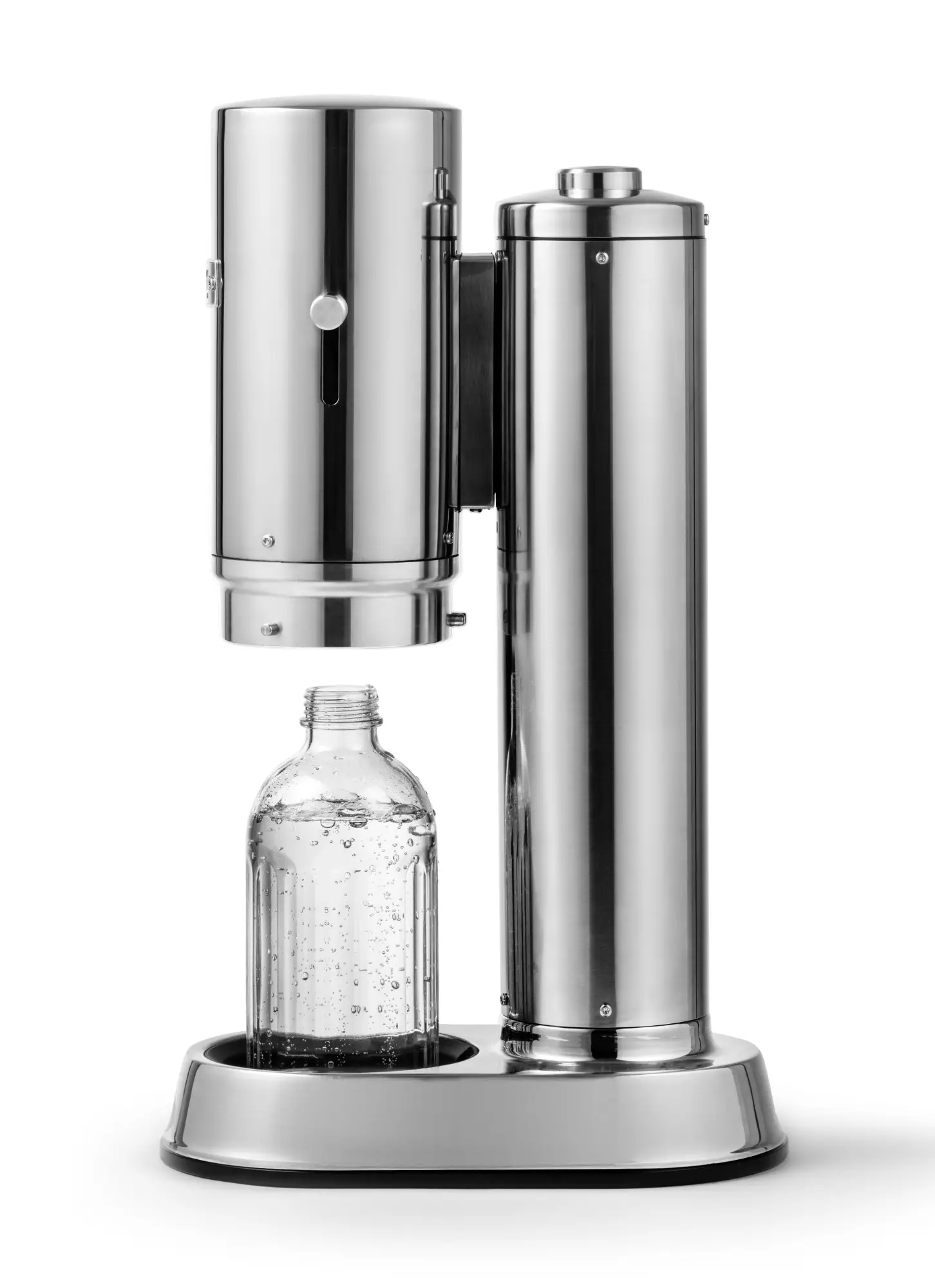 Prezentowany saturator do wody Carbonator Pro to urządzenie do przygotowywania wody gazowanej o wymiarach 29,6 x 17,3 x 50,2 cm (dł. x szer. x wys.) i wykończeniu w srebrnym kolorze. Wykonany został on z wysokiej jakości materiałów - obudowa ze stali nierdzewnej, u podnóża guma zabezpieczająca blat przed zarysowaniami - co zapewnia długi cykl życia. Wewnątrz maszyny zostały zamontowane amortyzatory i sprężyny gazowe generujące płynne ruchy, tworząc przyjemne, bezproblemowe użytkowanie. Łatwość w używaniu zapewnia również unikalna funkcja Push-to-Lock, umożliwiająca obsługę jedną ręką, dzięki której można przygotować świeżą musującą wodę za naciśnięciem jednego przycisku (naciśnij raz górny przycisk, jeśli chcesz więcej bąbelków; naciśnij ponownie przycisk, a potem jeszcze raz, aby naprawdę wzmocnić bąbelki). W komplecie do saturatora dołączono szklaną butelkę o pojemności 800 ml (700 ml do linii napełnienia) z metalową zakrętką (nadaje się do mycia w zmywarce), ściereczkę oraz instrukcję obsługi w j. polskim.