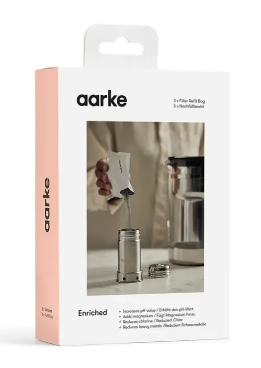 Prezentowany wkład do filtra Enriched zawiera 3 opakowania wzbogaconego granulatu filtrującego, który tworzą żywica jonowymienna, węgiel aktywny i magnez mineralny. Sprawia on, że woda nie tylko staje się bardziej miękka, czystsza i smaczniejsza, redukując kamień, chlor i metale ciężkie, ale i dodaje minerały magnezu, które wspomagają funkcjonowanie mięśni, a także zamienia wodę z kranu w wodę alkaliczną poprzez zwiększenie wartości pH. Wkład jest łatwy w używaniu - granulki wsypuje się bezpośrednio do wkładu filtra. Produkt przeznaczony jest wyłącznie dla technologii Aarke.