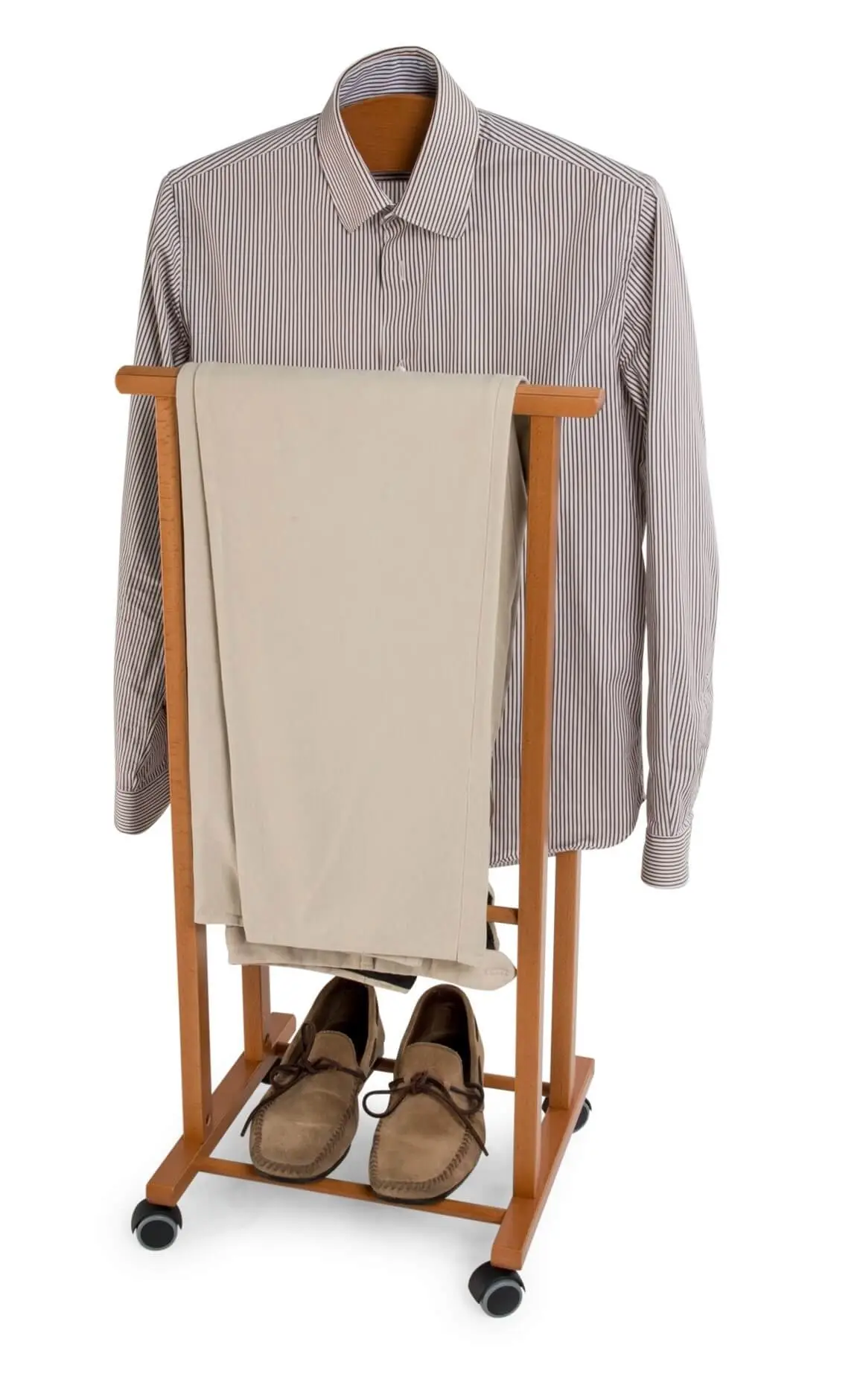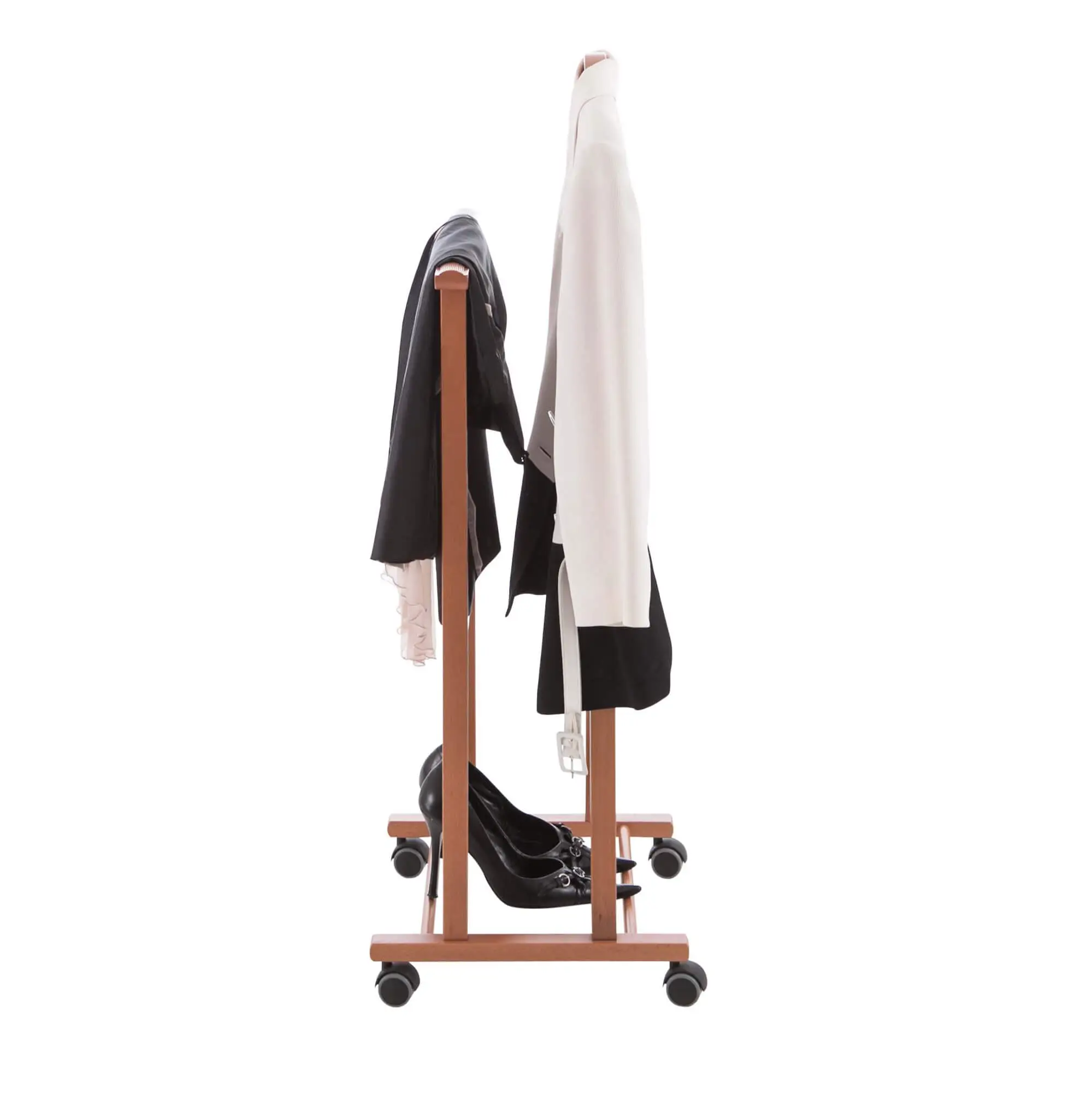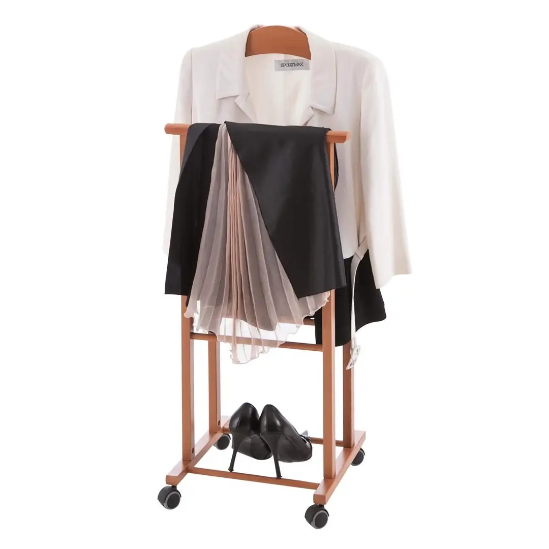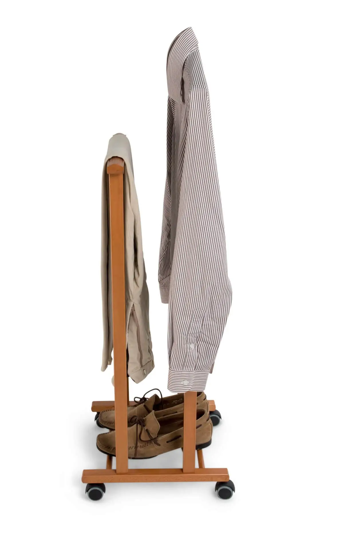 Wykonany z litego drewna bukowego zapewnia stabilność, pozwalając na przechowywanie odzieży w nienagannym stanie. Stojak składa się z wyprofilowanego wieszaka na koszulę lub marynarkę oraz uchwytu na spodnie. Dzięki niemu z łatwością utrzymasz swój strój w idealnym stanie i gotowości do założenia następnego dnia. Dodatkowo ATRI posiada gumowe kółka, które umożliwiają jego bezproblemowe przemieszczanie między pomieszczeniami, nie rysując przy tym podłogi.