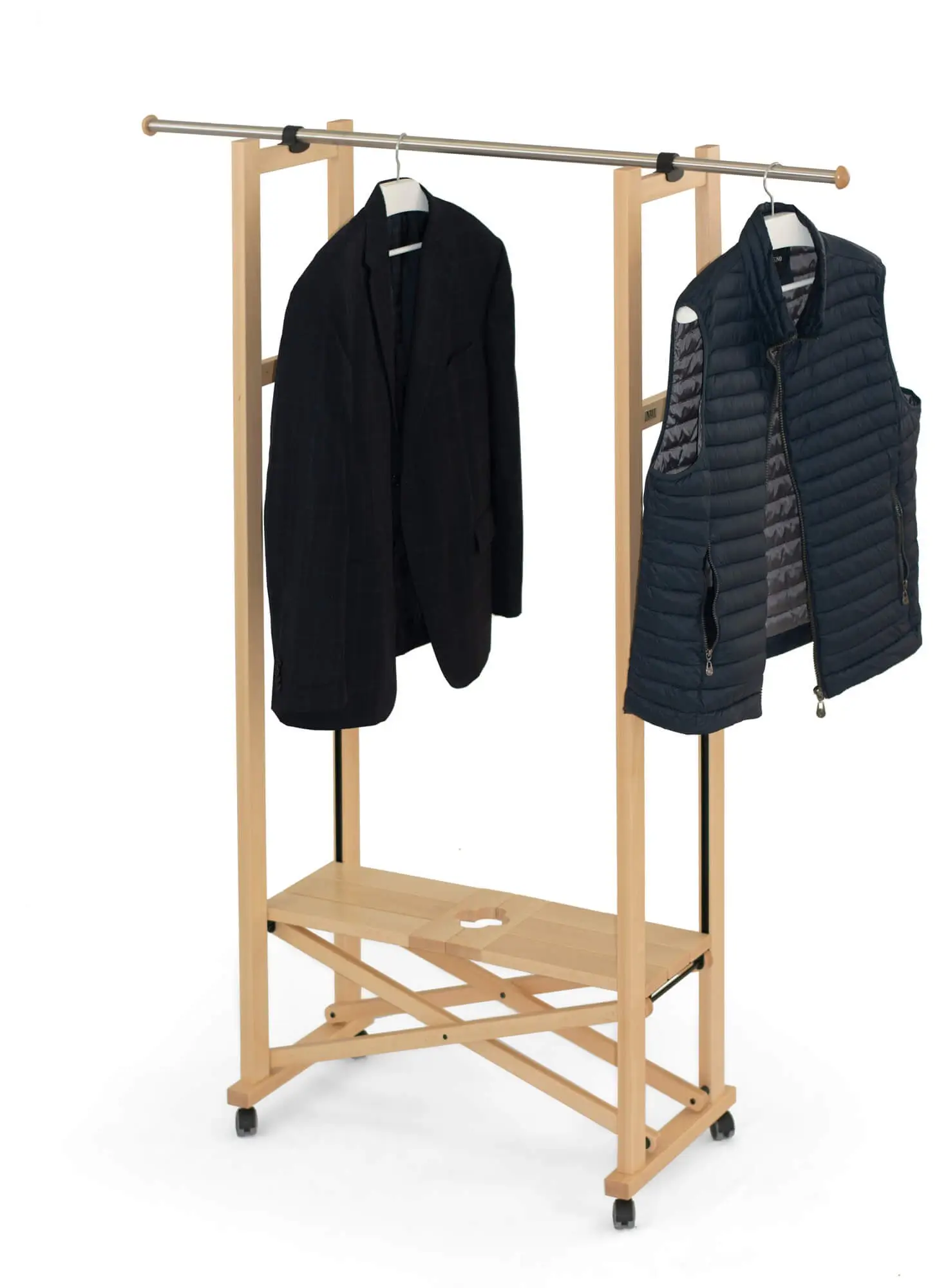 Jego design opiera się na solidnej konstrukcji z drewna bukowego, co oprócz estetycznego wyglądu zapewnia także trwałość i stabilność. Dzięki rozsuwanemu drążkowi ze stali nierdzewnej, którego długość można regulować od 78 do aż 140 cm, dostosujesz stojak do swoich obecnych potrzeb przechowywania. Szeroka dolna półka wykonana z drewna, zapewnia dodatkowe miejsce na buty, torebki czy inne akcesoria, co sprawia, że organizacja przestrzeni staje się o wiele łatwiejsza. Ponadto, dzięki obrotowym gumowym kółkom, stojak jest bardzo łatwy w przemieszczaniu pomiędzy pomieszczeniami.