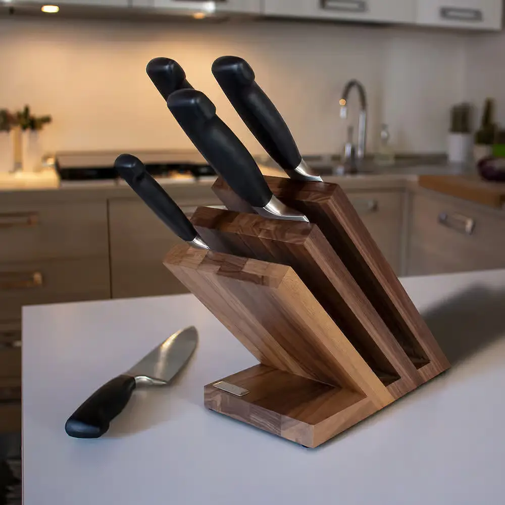 Stojak może pomieścić do 6 noży o maksymalnej długości ostrza 29 cm. Wykonany jest z litego drewna orzechowego i pokryty specjalnym lakierem dopuszczonym do kontaktu z żywnością. Dostępny jest w wersji z drewna bukowego oraz ze szlachetnego drewna orzechowego. Oba modele znajdą swoje miejsce zarówno w kuchni domowej, jak i profesjonalnej. Doskonały wybór dla miłośników elegancji i jakości w jednym.