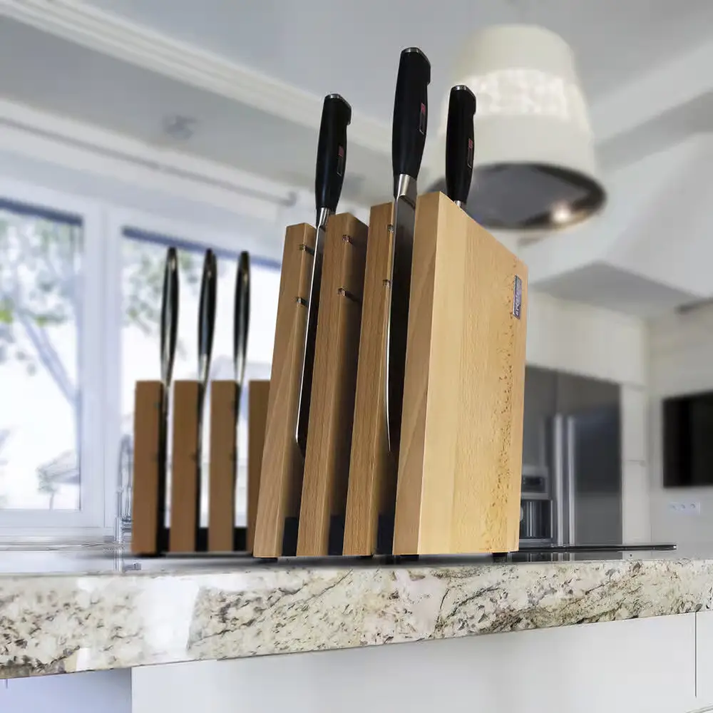 Stojak ma 3 moduły o długości 15 cm i może pomieścić najczęściej używane noże kuchenne o długości ostrza do 23.5 cm. Wykonany jest z litego drewna bukowego i pokryty specjalnym lakierem dopuszczonym do kontaktu z żywnością.