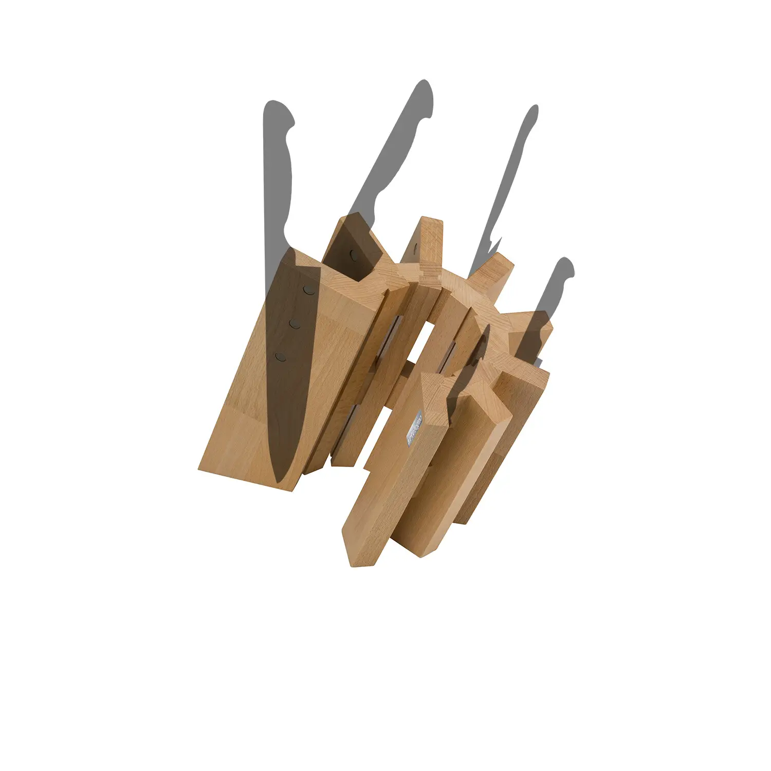 Stojak może pomieścić 8 noży o maksymalnej długości ostrza 28.5 cm. Wykonany z litego drewna bukowego, to nie tylko wspaniałe połączenie estetyki i trwałości, ale także wyraz oddania dla środowiska naturalnego. Całkowicie nadające się do recyklingu drewno gwarantuje, że Twoje wybory będą zgodne z wartościami zrównoważonego rozwoju. Blok jest starannie pokryty bezpiecznym dla żywności olejem, który nadaje mu gładką fakturę, doskonałą hydrofobowość i odporność na uporczywe plamy.