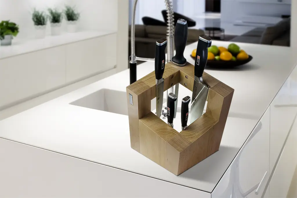 Blok może pomieścić 8 noży o maksymalnej długości ostrza 25.5 cm. Wykonany z litego drewna bukowego, to nie tylko wspaniałe połączenie estetyki i trwałości, ale także wyraz oddania dla środowiska naturalnego. Całkowicie nadające się do recyklingu drewno gwarantuje, że Twoje wybory będą zgodne z wartościami zrównoważonego rozwoju. Blok jest starannie pokryty bezpiecznym dla żywności olejem, który nadaje mu gładką fakturę, doskonałą hydrofobowość i odporność na uporczywe plamy.