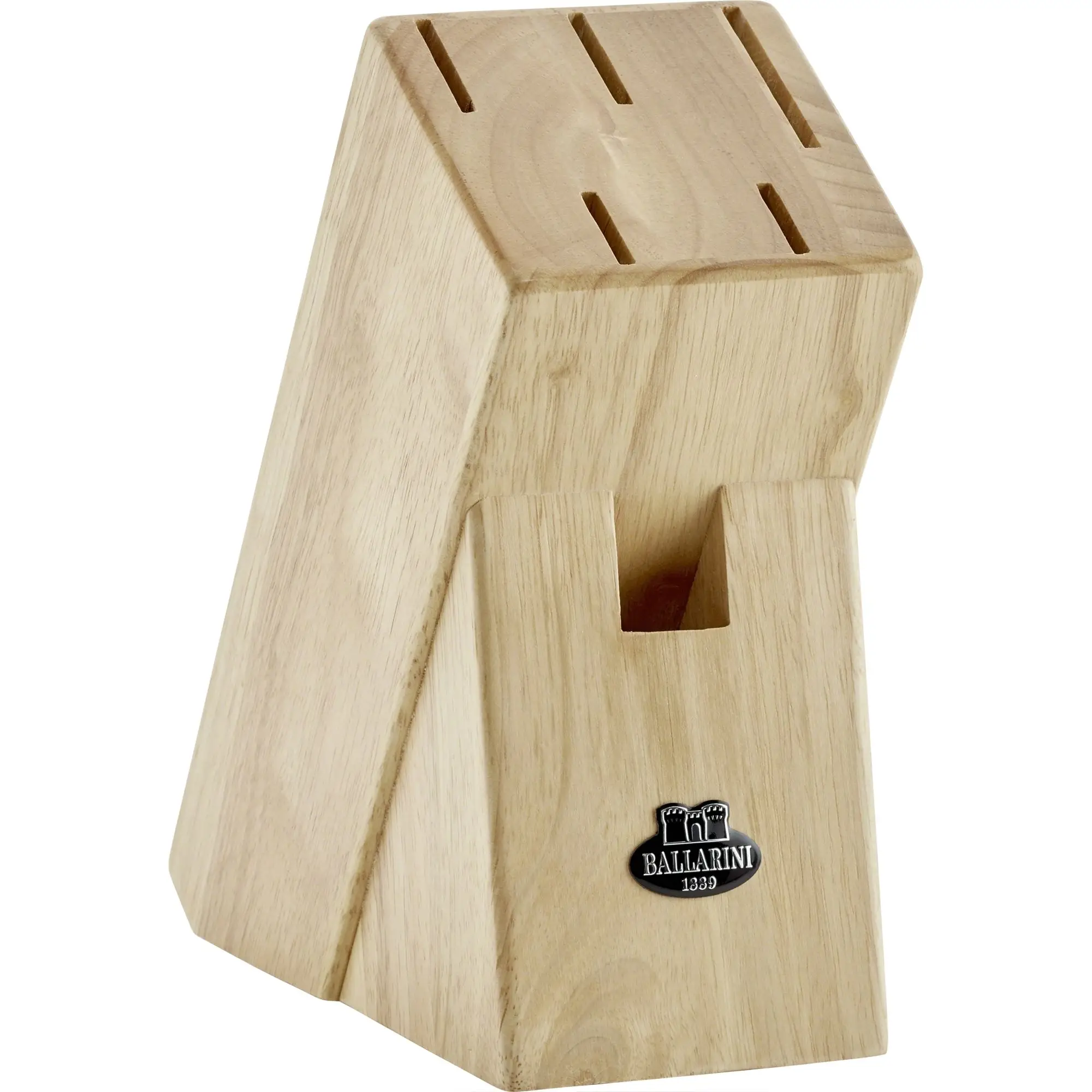 Stylowy i elegancki blok firmy Ballerini to najbezpieczniejszy i niezwykle wygodny sposób na przechowywanie noży kuchennych. Zbudowany został z najwyższej jakości, sezonowanego drewna bukowego. Znajdują się w nim gniazdka na noże w ilości 5 sztuk, a także gniazdo na nożyce kuchenne.