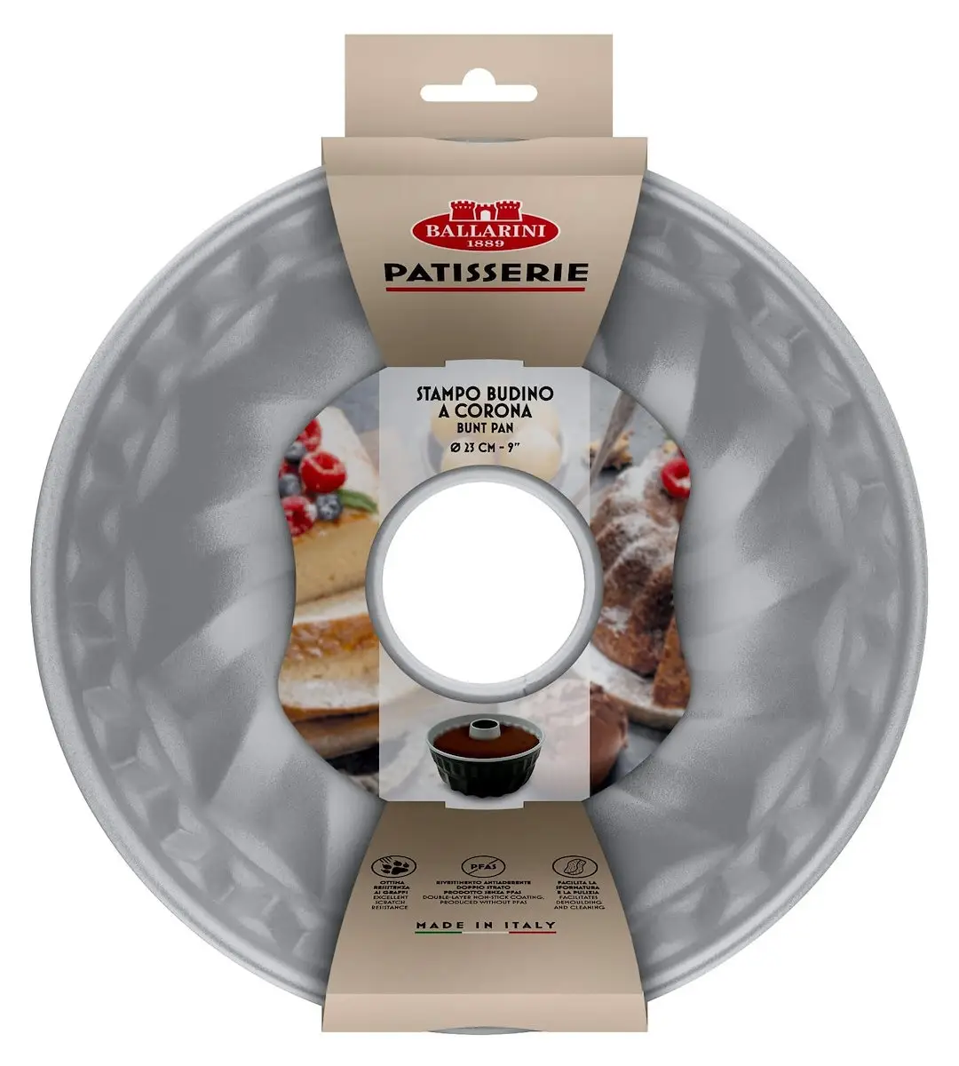 Ballarini Patisserie 23 cm to klasyczna forma do pieczenia babek, wyposażona w centralny stożek, który nadaje wypiekom tradycyjny kształt i zapewnia równomierne pieczenie. Seria Patisserie została zaprojektowana z myślą o najbardziej wymagających miłośnikach domowych wypieków.