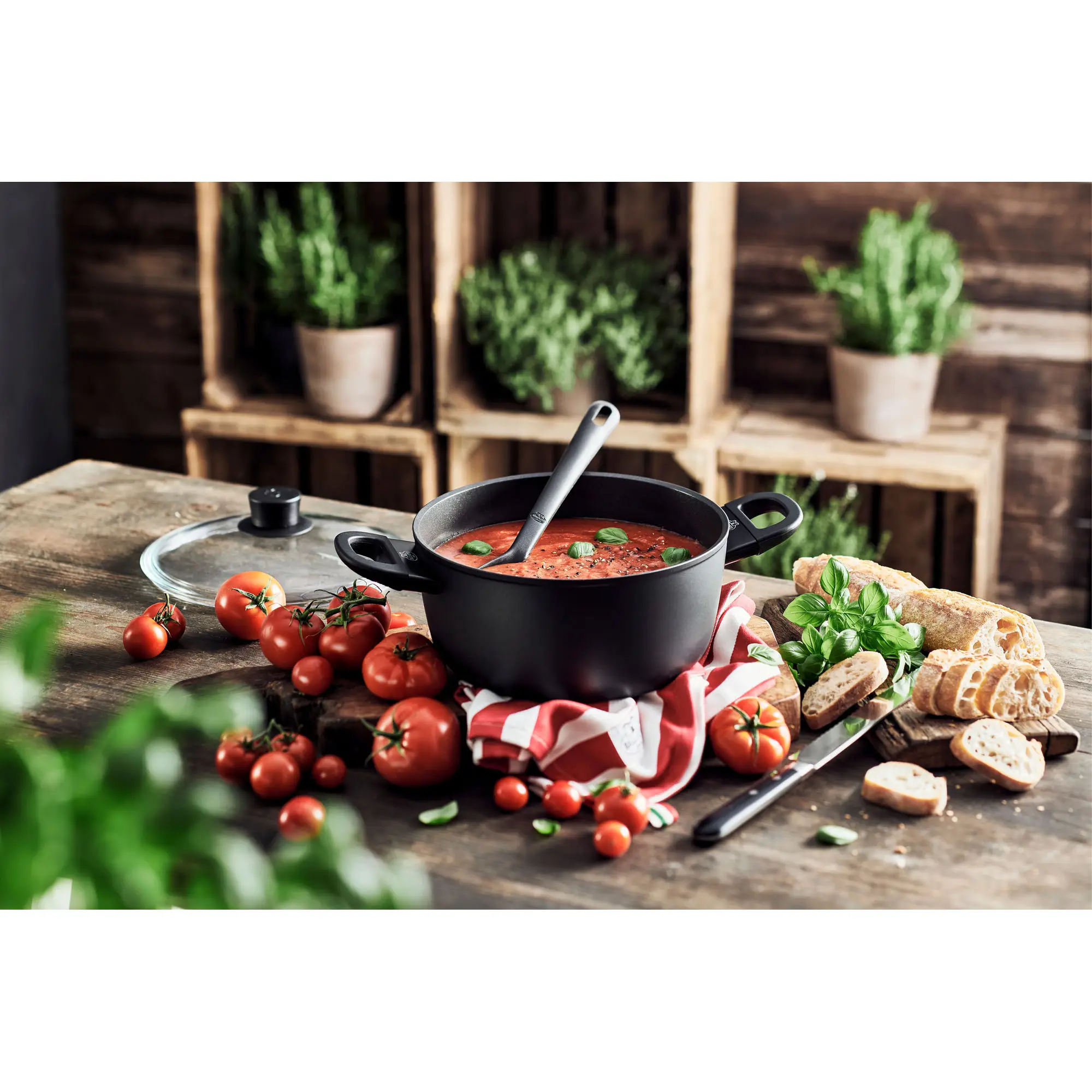 Garnek z pokrywką Avola 20 cm wykonany jest z aluminium, dzięki wbudowanemu w podstawę stalowemu rdzeniowi nadaje się na kuchnie indukcyjne. Promienista struktura dna umożliwia szybkie rozprowadzanie ciepła. Czterowarstwowa powłoka Keravis Titanium Extreme z cząstkami mineralnymi, zapobiega przywieraniu potrawy. Naczynie wyposażone jest w szklaną pokrywę. Wygodne, nie nagrzewające się uchwyty z tworzywa sztucznego świetnie leżą w dłoni.