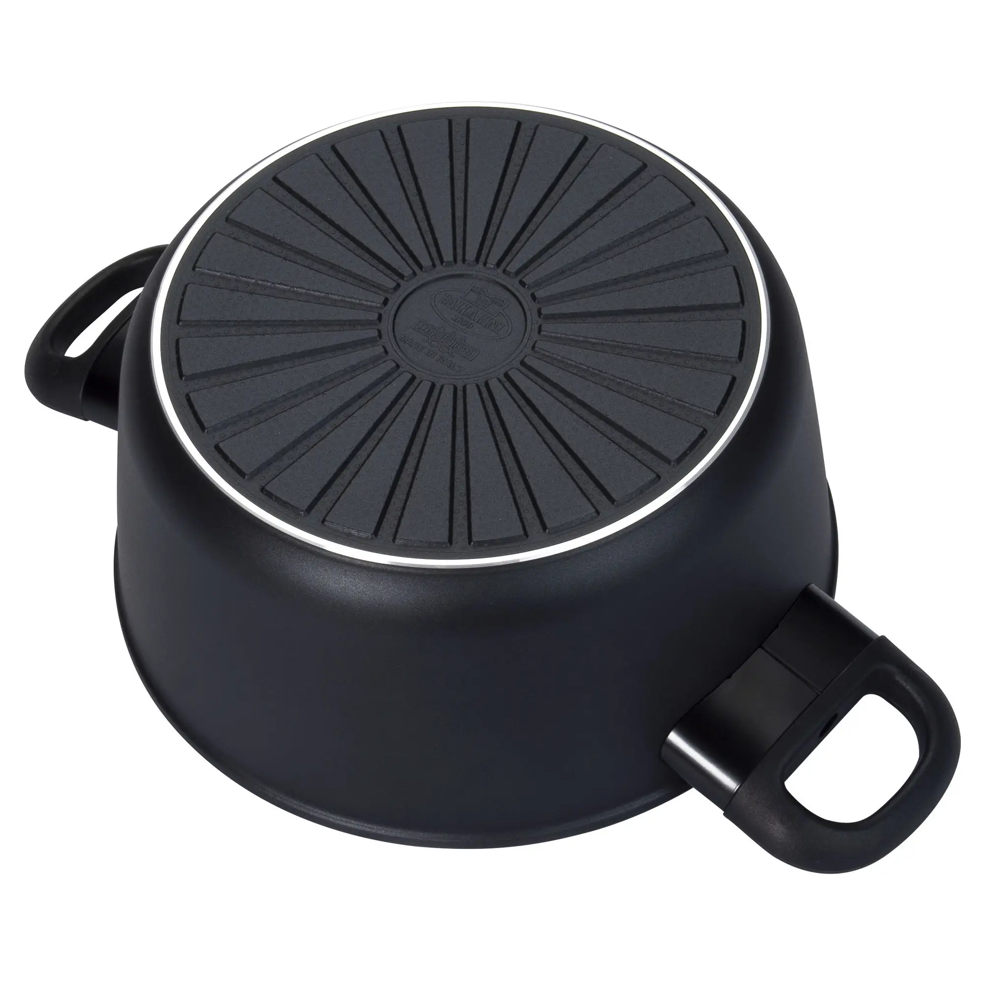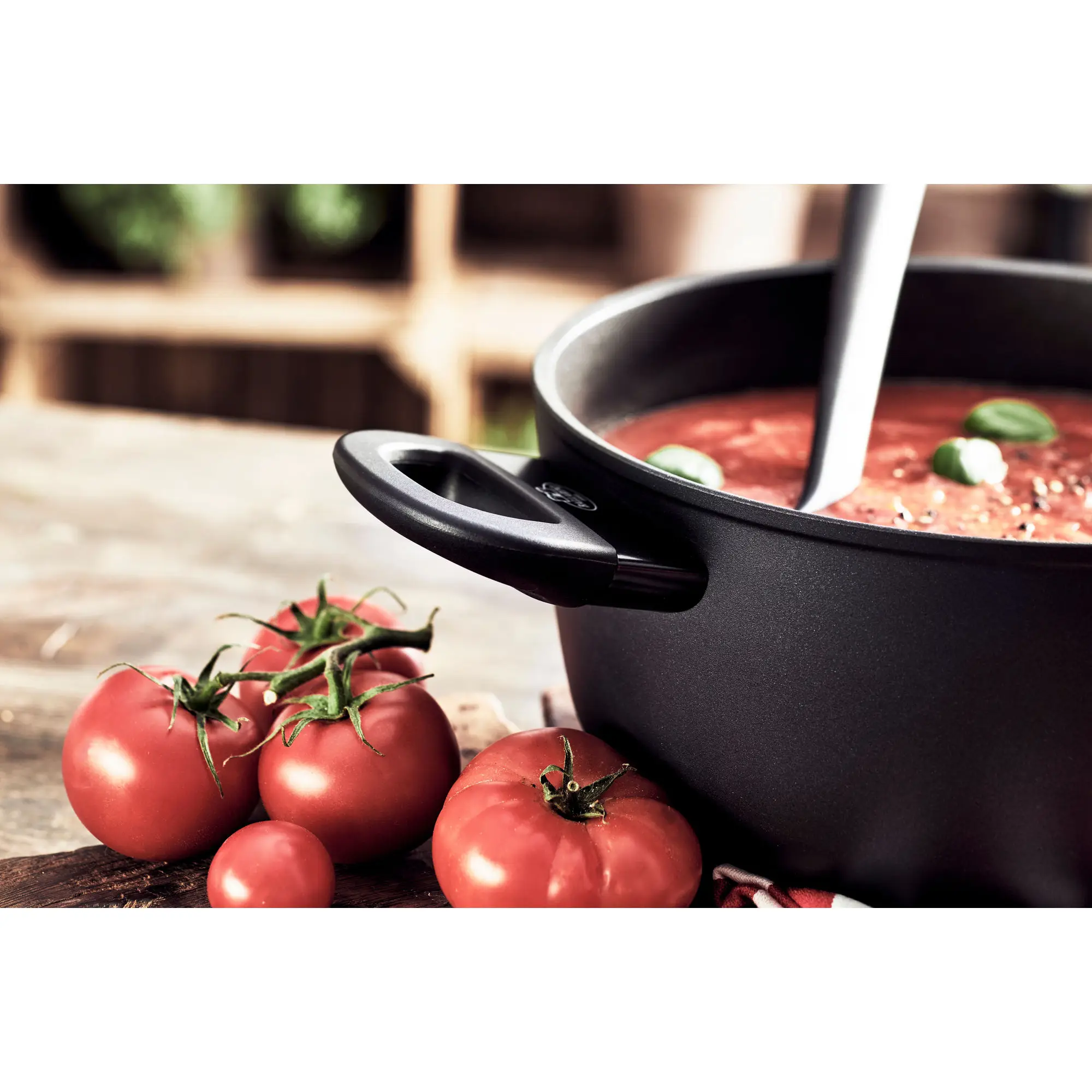 Garnek z pokrywką Avola 24 cm przeznaczony jest do uniwersalnego zastosowania w kuchni; idealny do wszelkiego rodzaju zup czy gulaszy, a także wszelkich innych potraw gotowanych i duszonych. Wykonany jest z kutego na zimno aluminium. Dzięki wbudowanemu w podstawę stalowemu rdzeniowi doskonale nadaje się na kuchnie indukcyjne. Promienista struktura dna umożliwia szybkie rozprowadzanie ciepła. Czterowarstwowa powłoka Keravis Titanium Extreme z cząstkami mineralnymi, zapobiega przywieraniu potrawy. Naczynie wyposażone jest w szklaną pokrywę. Wygodne, nie nagrzewające się uchwyty z tworzywa sztucznego świetnie leżą w dłoni.