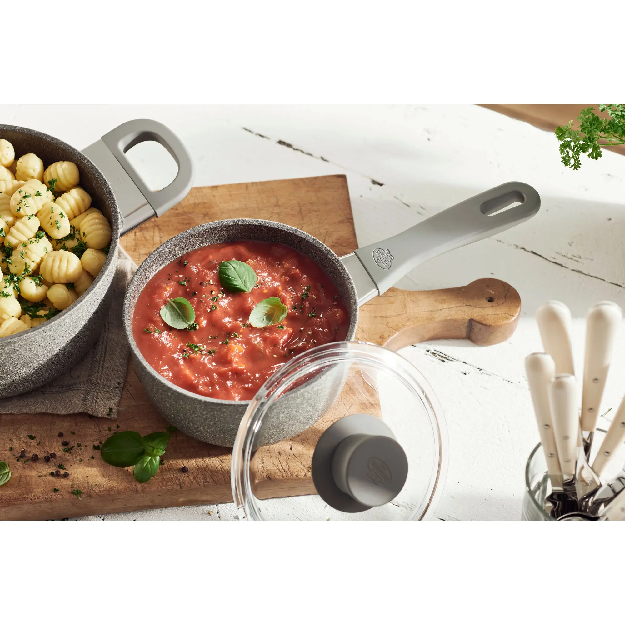 Garnek z pokrywką Murano 24 cm wykonany został z najwyższej jakości aluminium, kutego na zimno. Za sprawą wbudowanego w podstawę stalowego rdzenia doskonale nadaje się na kuchnie indukcyjne, a jego promienista struktura znacznie przyspiesza rozprowadzanie ciepła w jego wnętrzu. Pięciowarstwowa powłoka Granitium Extreme, w skład której wchodzą cząstki mineralne, zapobiega przywieraniu potrawy i jest odporna na uszkodzenia mechaniczne, dzięki czemu można z powodzeniem stosować metalowe przybory kuchenne bez ryzyka uszkodzenia. Wygodne uchwyty nie nagrzewają się, co jest gwarancją bezpiecznego użytkowania. Wyposażony jest w szklaną pokrywkę z plastikową gałką.