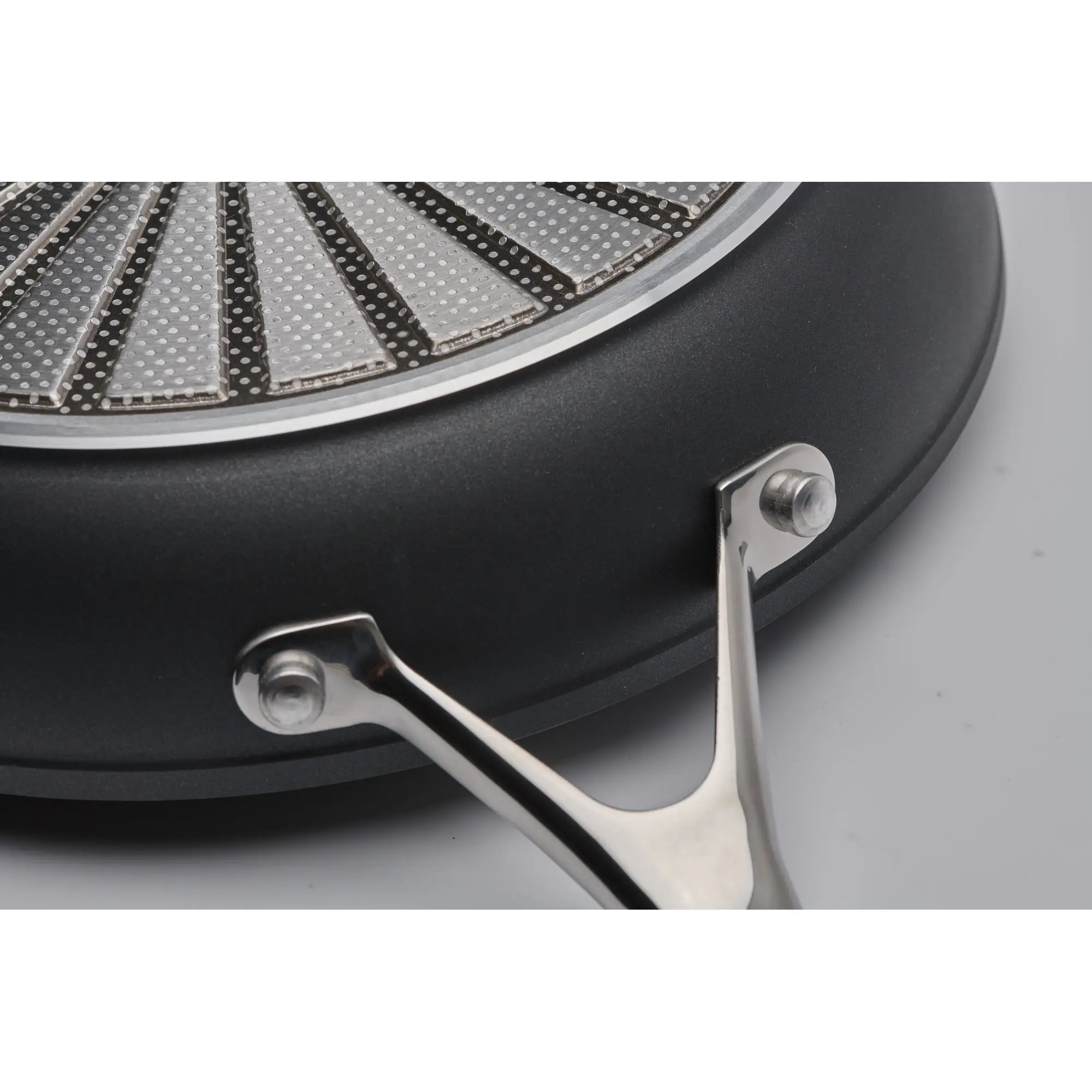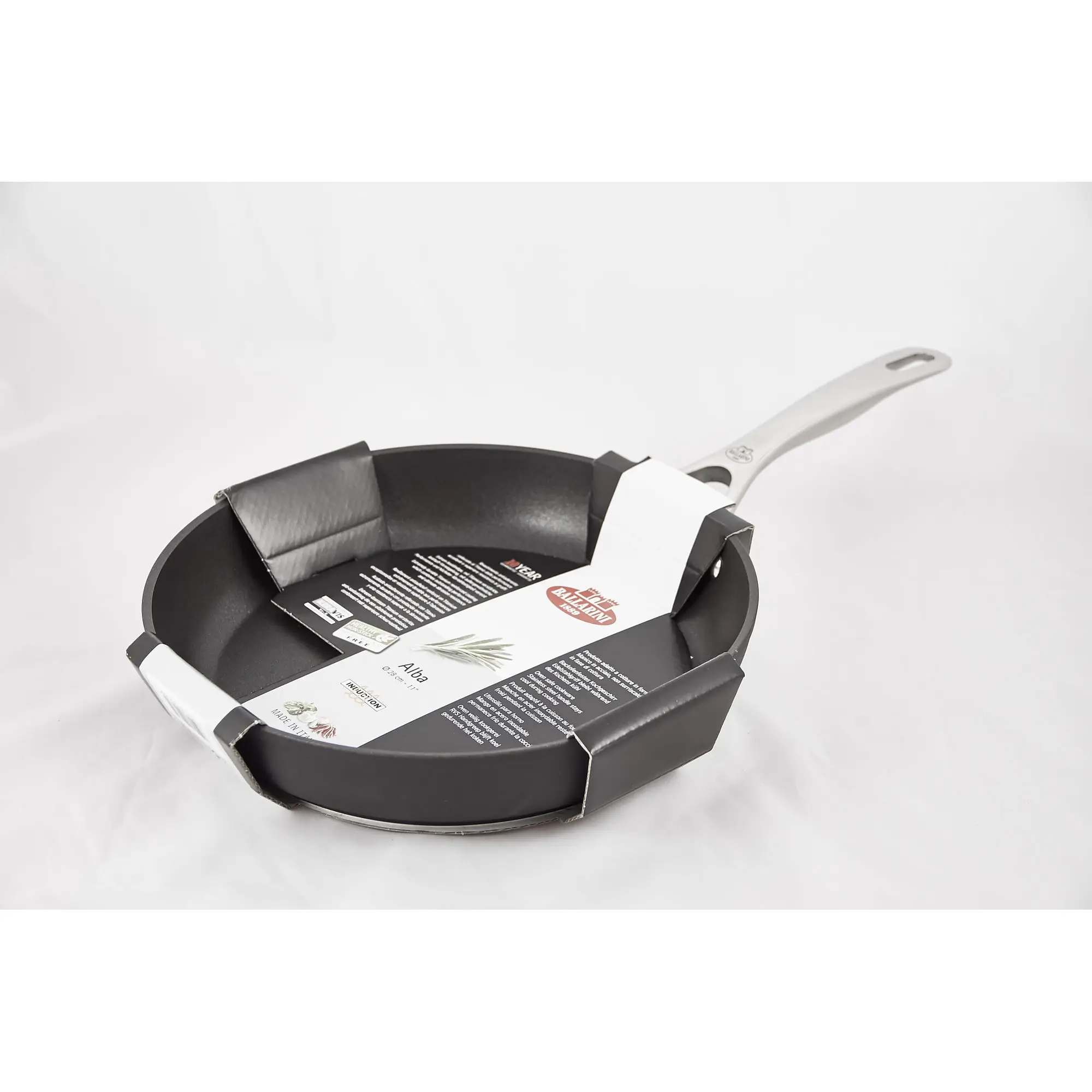 Patelnia indukcyjna Alba 20 cm wykonana została z najwyższej jakości aluminium, posiada grube na 4,5 mm dno, w którym znajduje się stalowy rdzeń. Pokryta jest od wewnątrz niezwykle trwałą powłoką Kerevis Titanium Exstreme, która zapobiega przywieraniu potraw. Idealnie wyprofilowany uchwyt ze stali nierdzewnej doskonale leży w dłoni. Patelnia nadaje się do mycia w zmywarce.