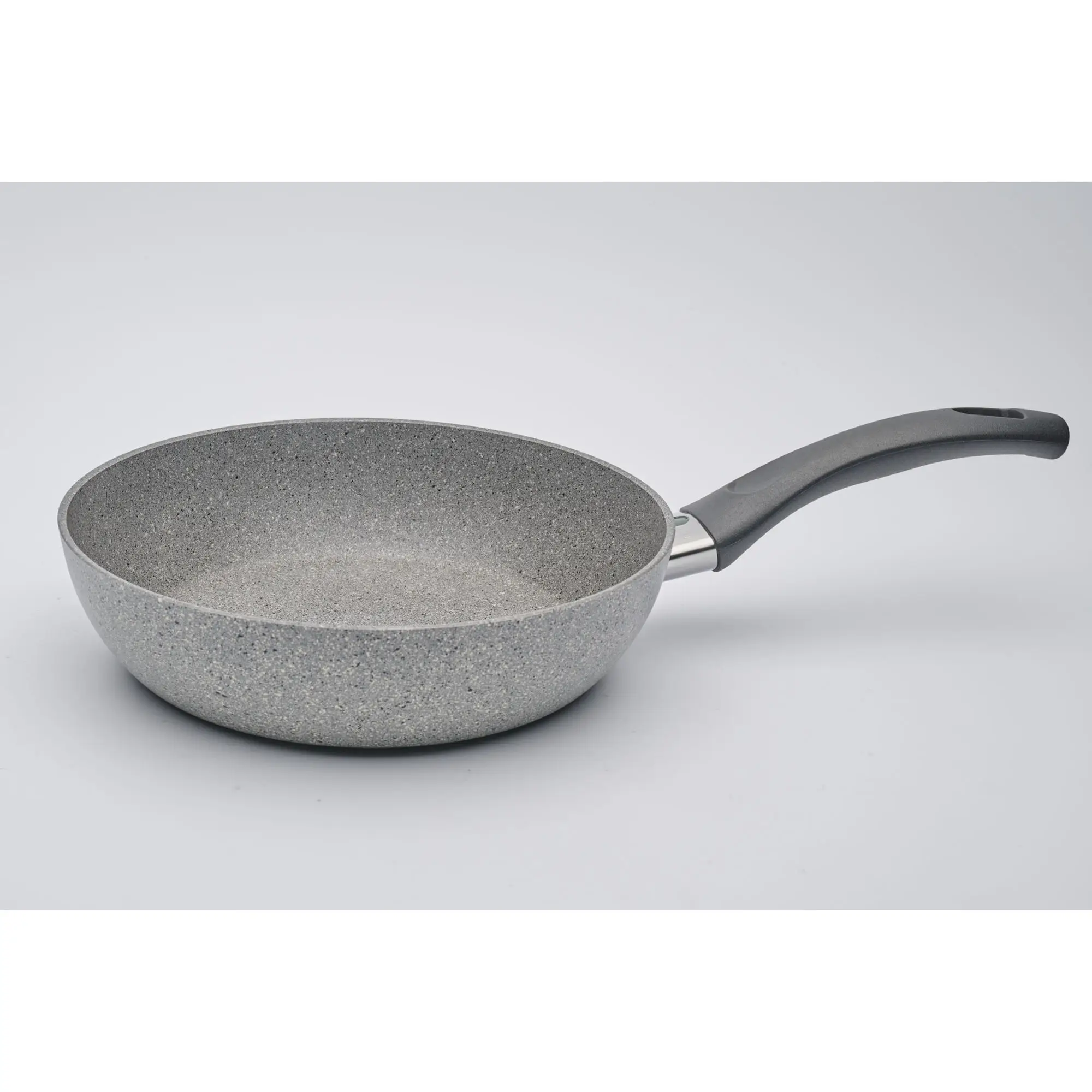 Patelnia indukcyjna głęboka Ferrara 24 cm wykonana została z litego aluminium kutego na zimno. Masywne dno patelni wzmocnione jest elementem ze stali nierdzewnej, o specjalnej fakturze, ułatwiającej przewodzenie ciepła i umożliwiającej stosowanie naczynia na kuchniach indukcyjnych. Powłoka Granitium Extreme z drobinami mineralnymi zapobiega przywieraniu. Uchwyt z tworzywa sztucznego, wzmocniony jest stalowym elementem.