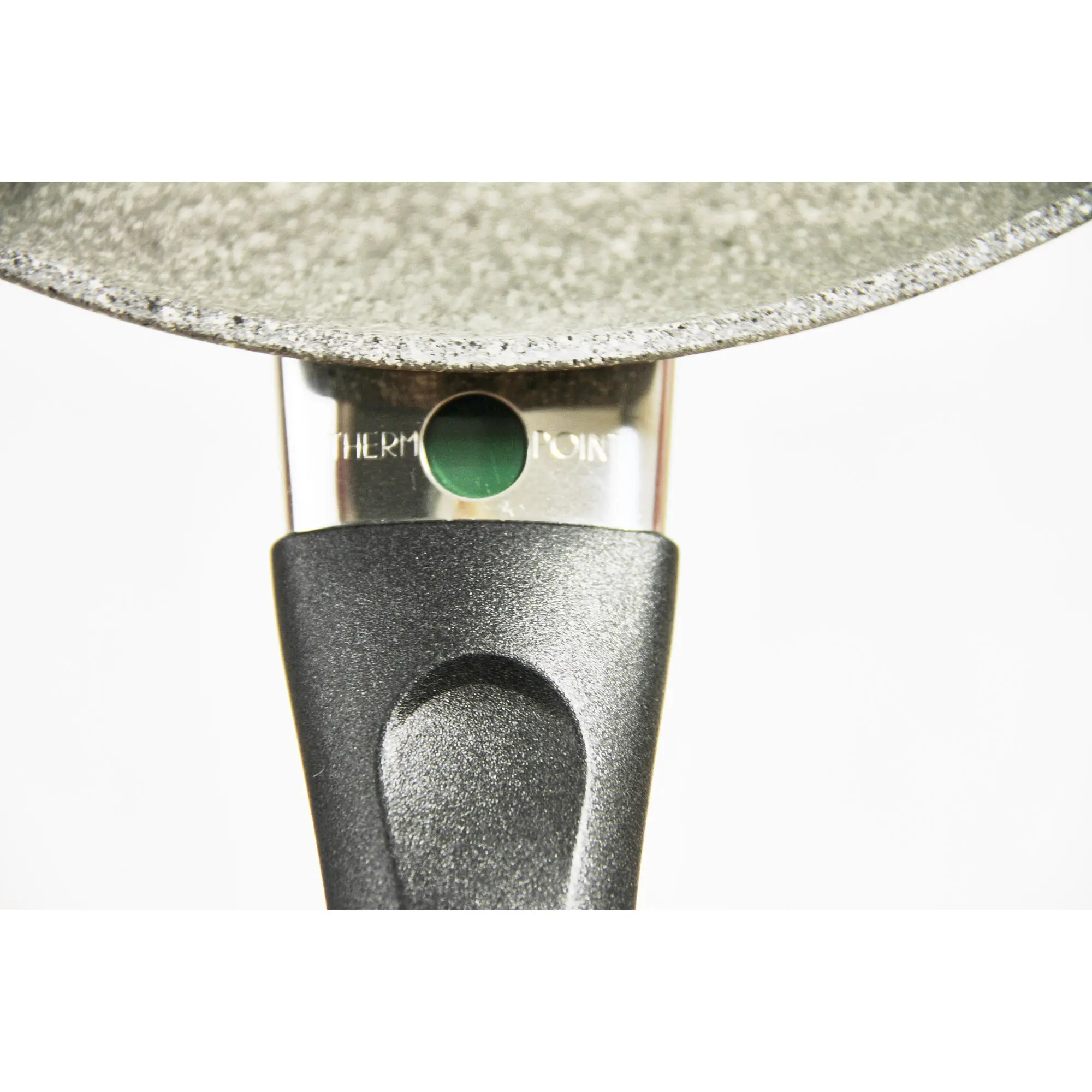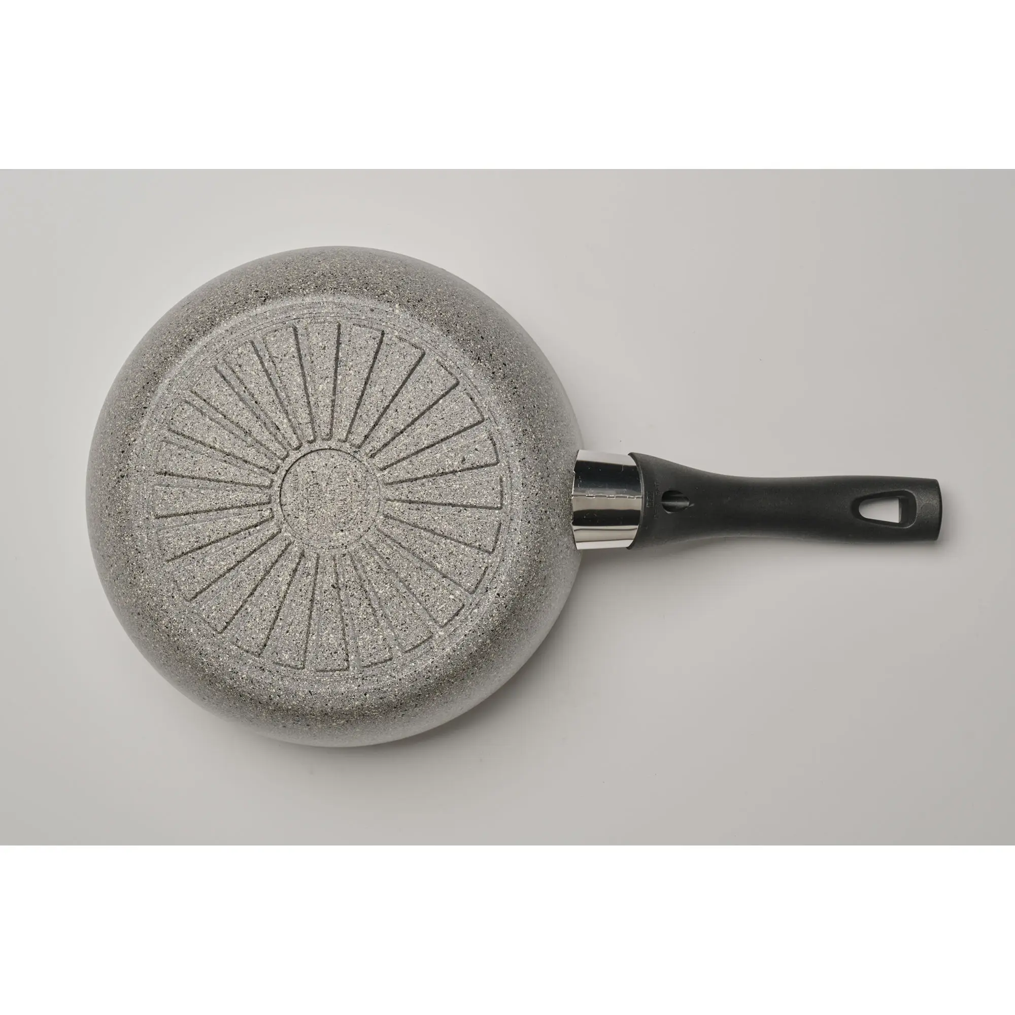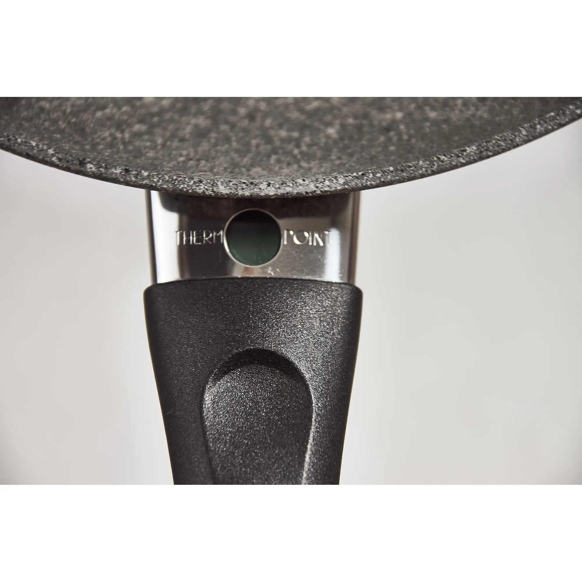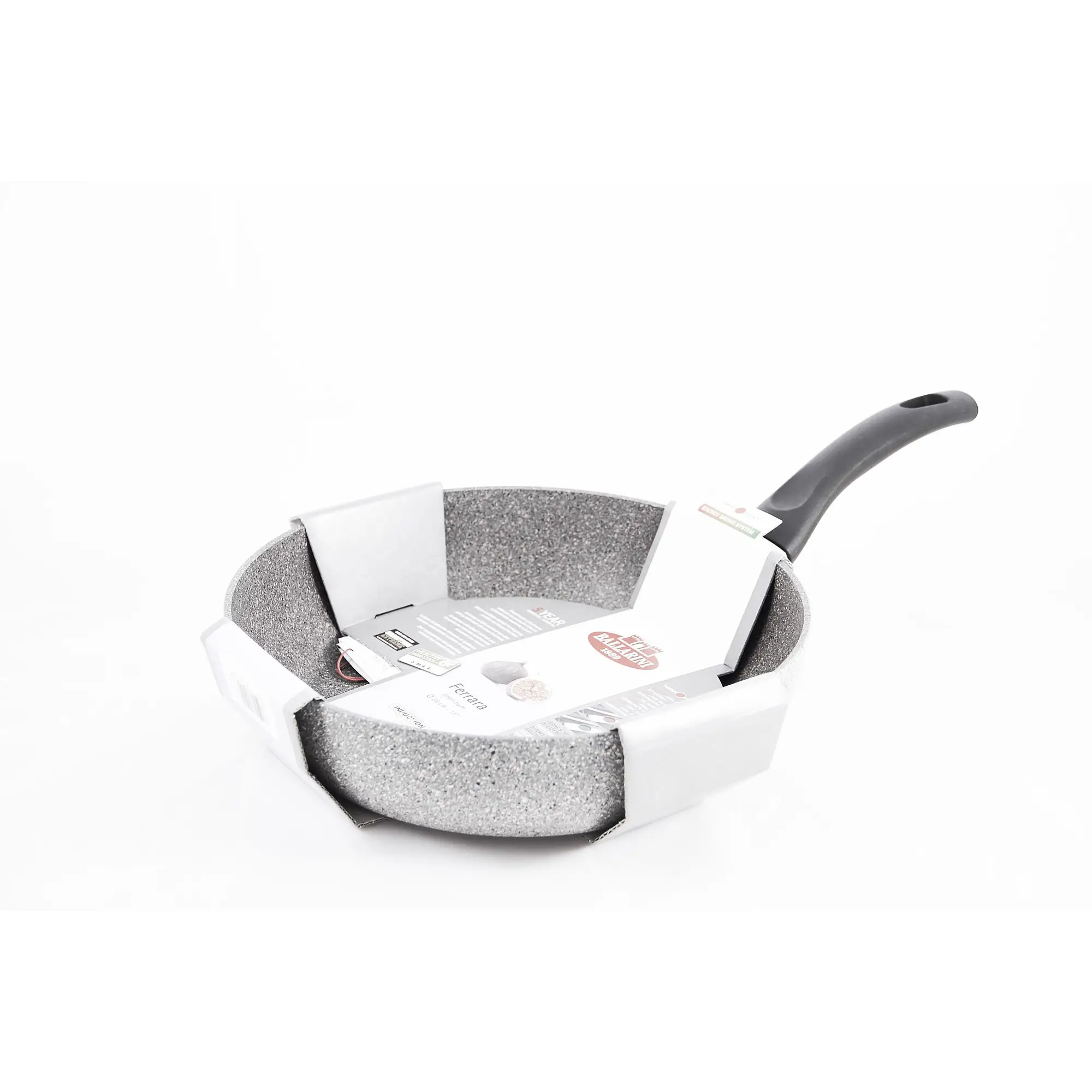 Patelnia indukcyjna głęboka Ferrara 28 cm przeznaczona jest do uniwersalnego zastosowania. Wykonana została z litego aluminium kutego na zimno. Grube, masywne dno patelni wzmocnione jest elementem ze stali nierdzewnej, o specjalnej fakturze, ułatwiającej przewodzenie ciepła i umożliwiającej stosowanie naczynia na kuchniach indukcyjnych. Powłoka Granitium Extreme z cząstkami mineralnymi zapobiega przywieraniu potrawy. Wygodny, ergonomiczny uchwyt z tworzywa sztucznego wzmocniony jest stalowym elementem i świetnie leży w dłoni.